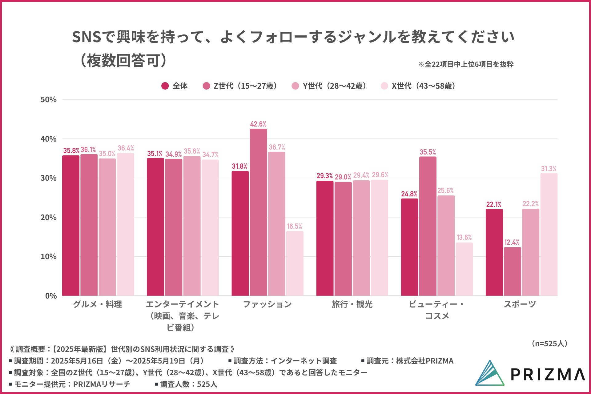 フォローされているジャンルは、Z世代では『ファッション』『ビューティー・コスメ』など“自己表現”や“トレンド重視”の傾向が強く、一方X世代では『グルメ・料理』『旅行』『スポーツ』といった“生活密着型”の関心が目立ちました。