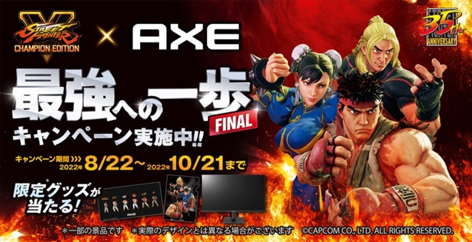 今回のコラボ最終弾では、“負けない香りをまとって”をコンセプトに、「ストリートファイター」の人気キャラクター「リュウ」をパッケージデザインに描き、ボタニカルハーブの香りを楽しめる「アックス フレグランス ボディソープ」を数量限定で発売します。また、AXE製品購入によりストリートファイターの豪華限定グッズ(スポーツタオル/クリアファイル)が抽選で当たるキャンペーンを開催。加えて、AXE公式Twitterでフォロー&リツイート、または公式Instagramでフォロー&コメント返信により応募ができ、抽選でゲーム環境を快適にする大型モニターが当選するオープンキャンペーンも開催いたします。