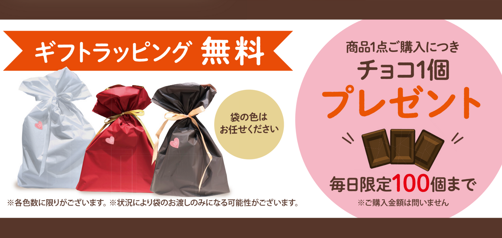 期間内にお買い上げの方には、バレンタイン向けのラッピングを無料でご提供しています。また、毎日限定100個まで、商品1点ご購入につき、チョコレートを1個プレゼントいたします。