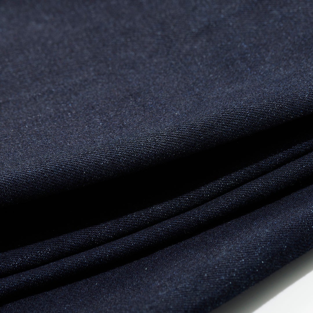 縦糸・緯糸ともに3.3番手という超太番手の糸を最大限まで打ち込み、旧式のシャトル織機でゆっくりと丁寧に織られたデニムは、身に纏うのを躊躇するほど堅く武骨な印象を受ける。
