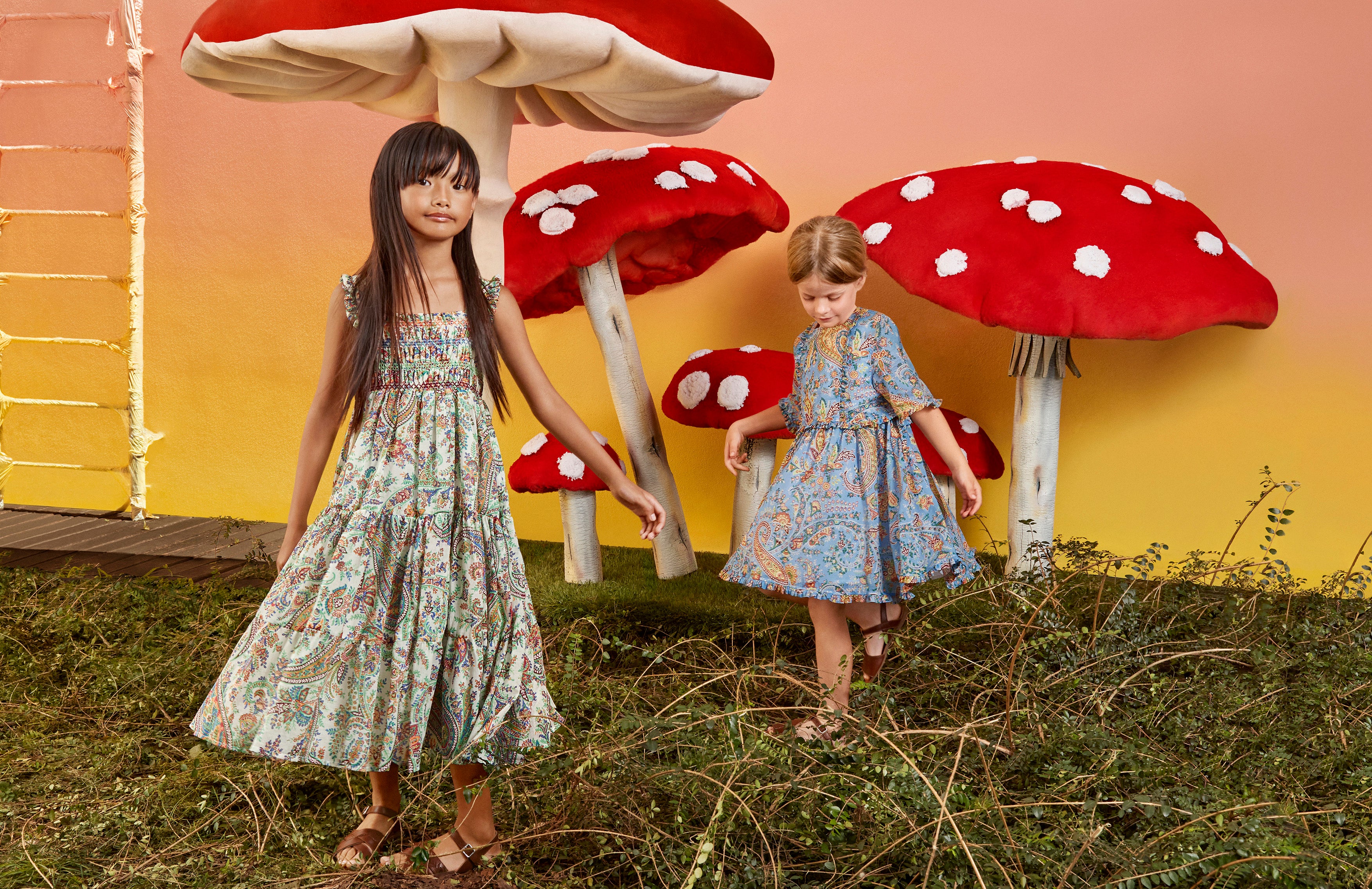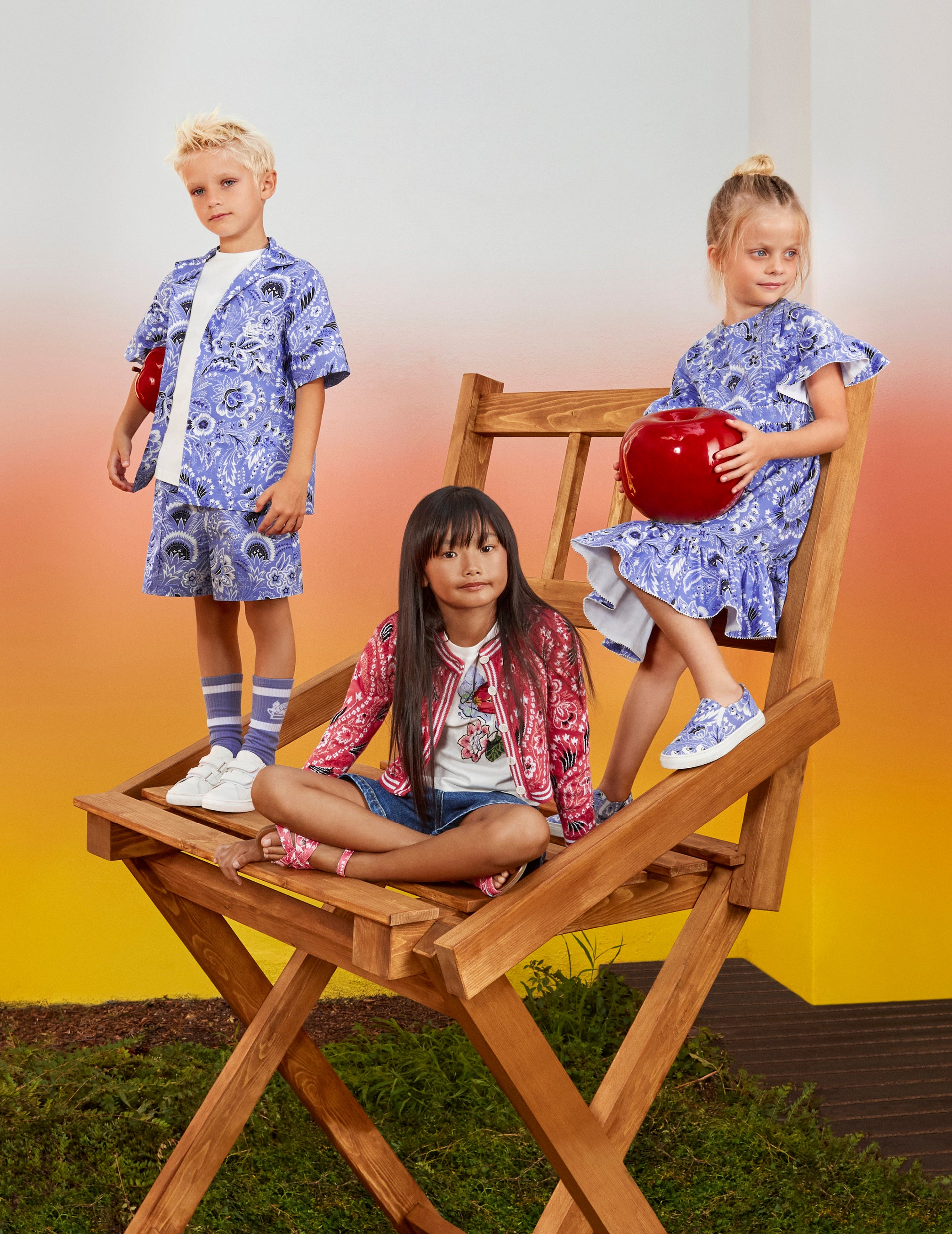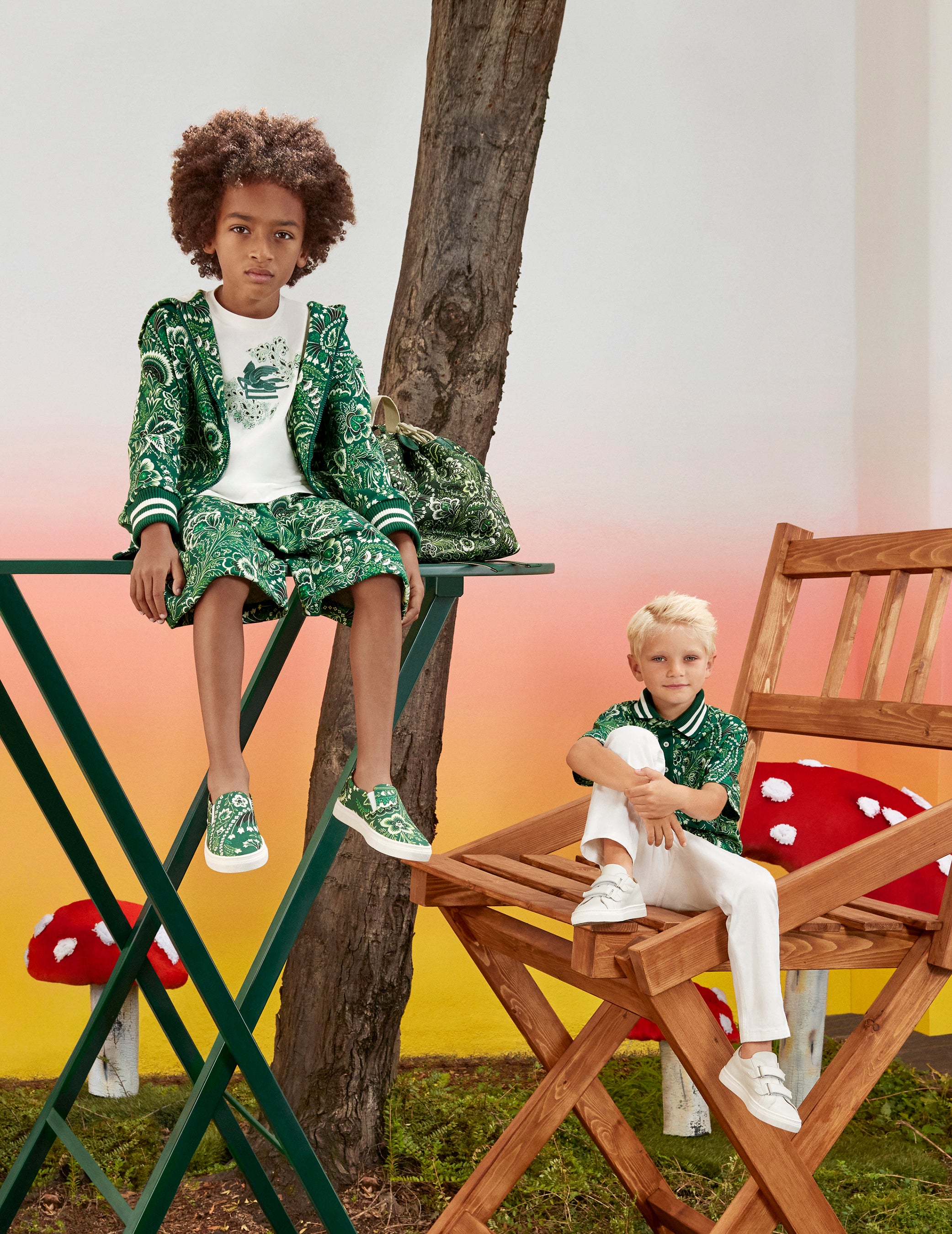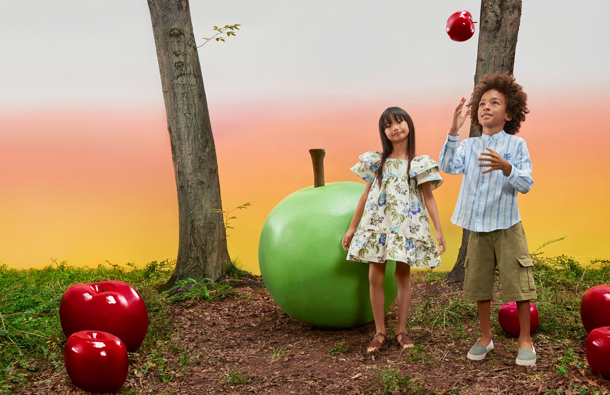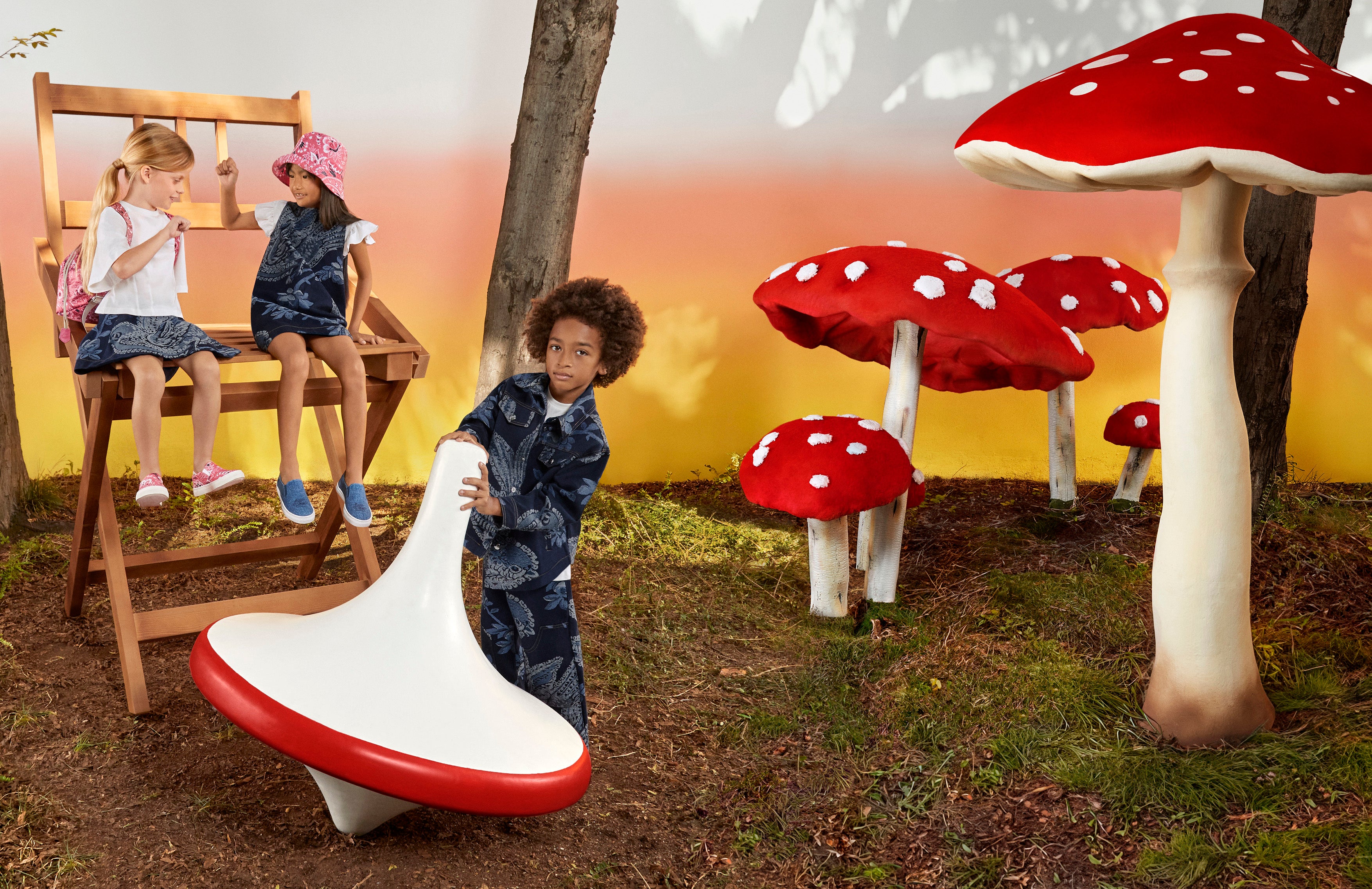 キャンペーンビジュアルは、おとぎ話の世界を彷彿とさせる、マジカルな魅力にあふれるエトロワールドが舞台です。巨大なりんごやきのこ、幻想的なおもちゃに囲まれて遊ぶ小さな主役たちが、活き活きとした色使いとアイコニックなモチーフによる楽しいエトロ キッズコレクションの世界観を描いています。