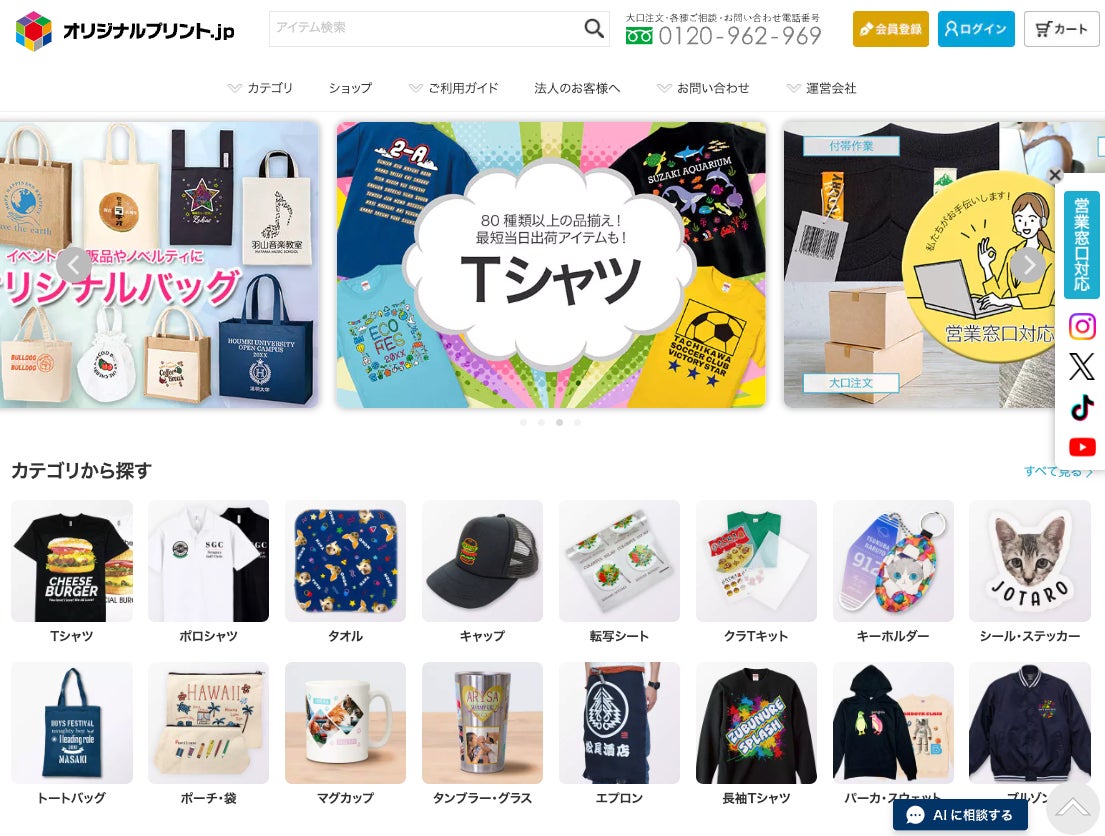 Tシャツや雑貨等1500種類以上にプリントができる日本最大級のグッズ作成EC。商品選択⇒加工方法選択⇒印刷箇所選択⇒デザインツールでのデザインで、出来上がりイメージ/納期/金額を確認することでプリントアイテムをユーザー自身で完結して購入できる。