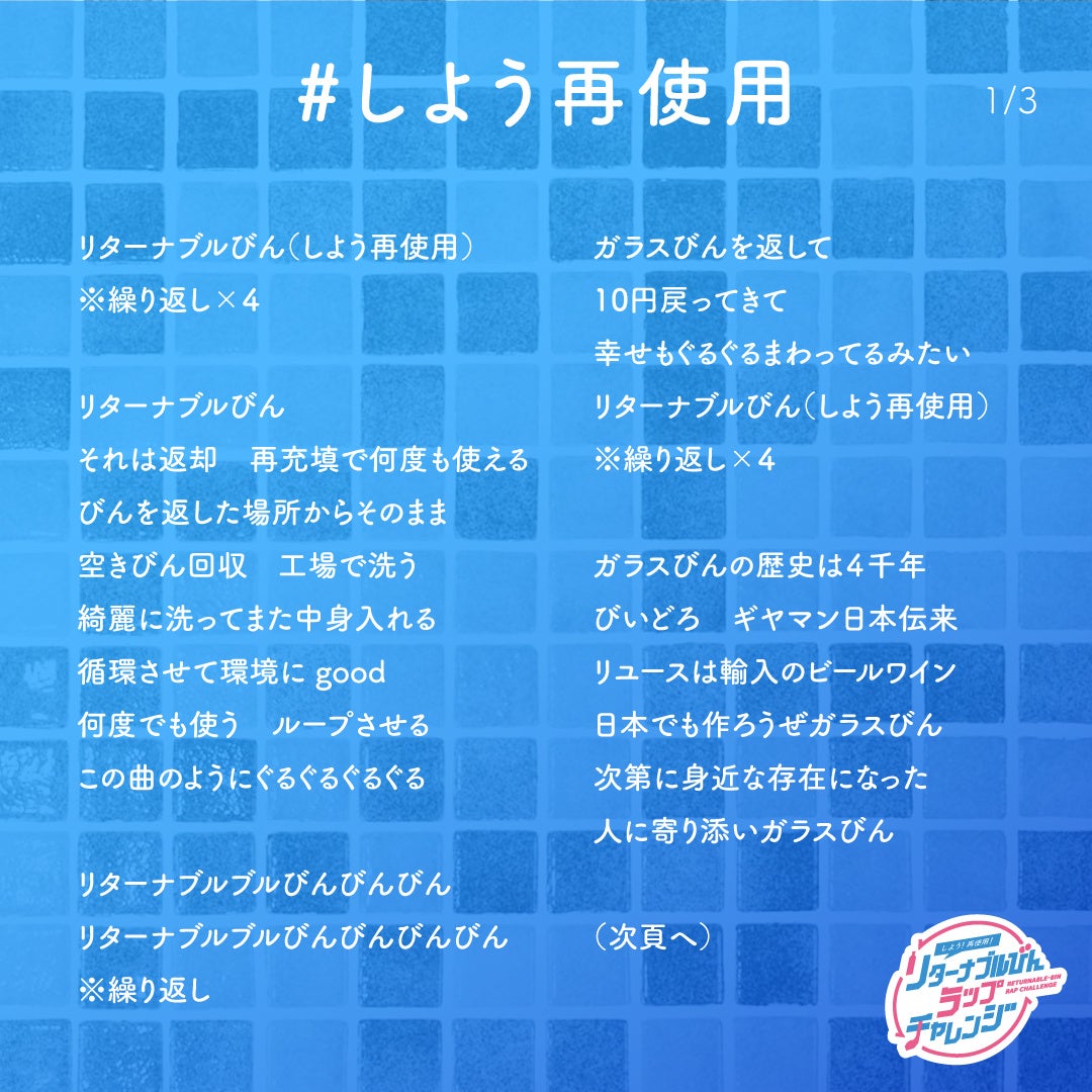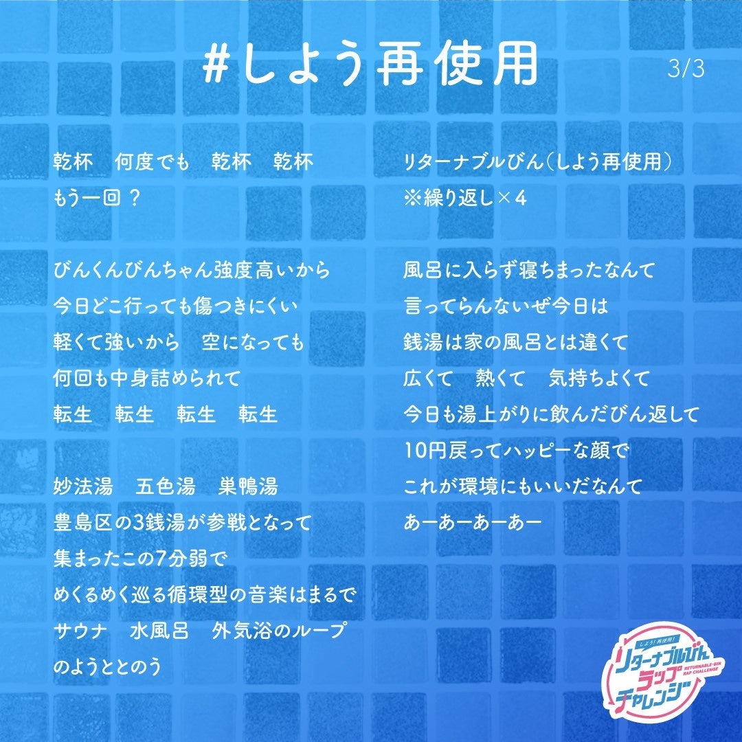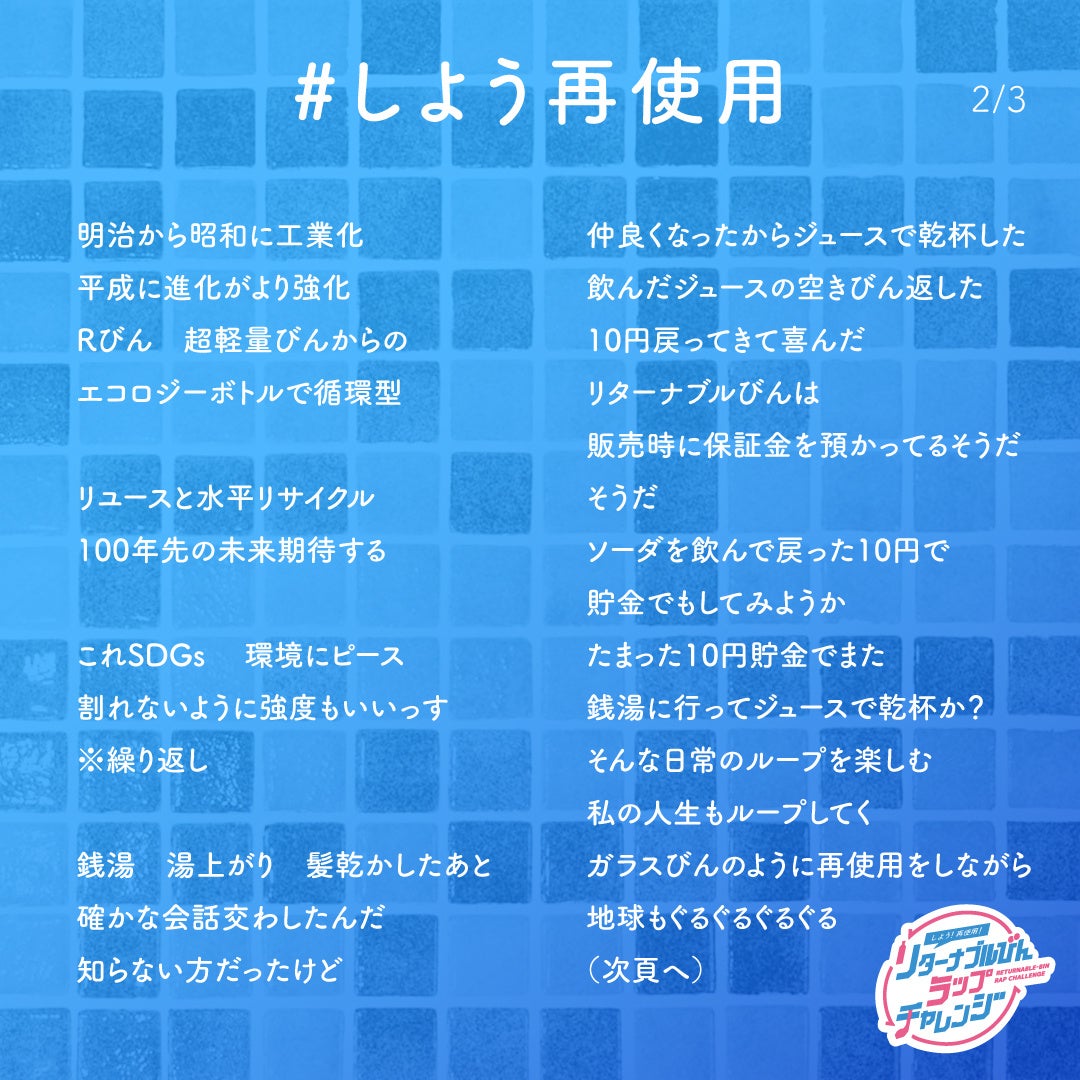 日本ガラスびん協会(会長:野口信吾/東京都 新宿区)では、リターナブルびん、びんリユースの仕組みの価値を再発見・再定義する活動「SO BLUE ACTION」を展開しています。今回その活動の一環として「しよう!再使用!リターナブルびんラップチャレンジ」を7/23(火)~8/13(火)で開催しました。その企画から誕生した、ラップソングのミュージックビデオを公開します。