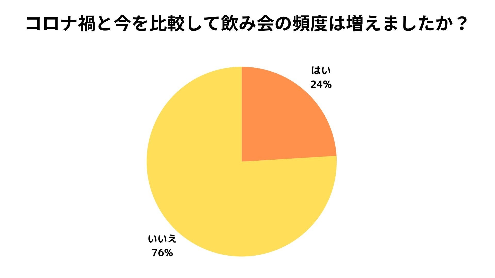 アンケートを取った20代全員に、コロナ禍と今を比較して飲み会の頻度が増えたかをきいたところ、76%の人が頻度は増えていないと回答しました。