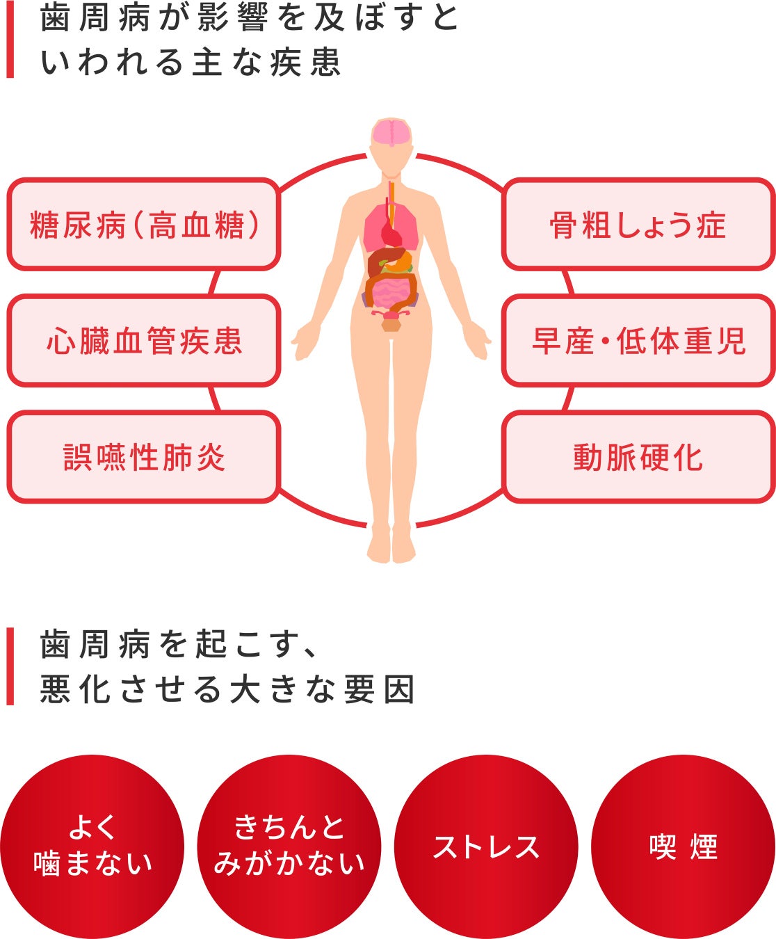 しかも歯周病は、糖尿病や誤嚥性肺炎、動脈硬化など全身のさまざまな病気と関わっていることも明らかになってきています。「オーラルフレイル」の入り口とも言える歯周病を予防することは、全身の健康を保つためにも極めて大切なことなのです。