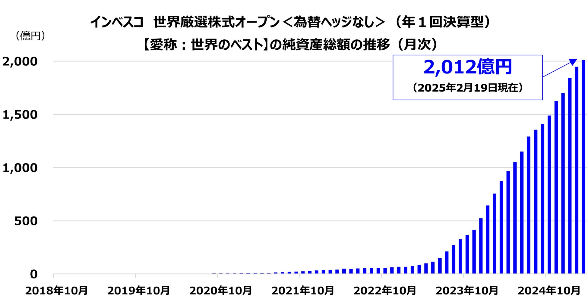 インベスコ・アセット・マネジメント株式会社(代表取締役社長兼CEO:佐藤秀樹、所在地:東京都港区)は同社が運用する公募追加型投資信託「世界のベスト」*1の中で、NISA成長投資枠対象ファンドの一つである「インベスコ 世界厳選株式オープン<為替ヘッジなし>(年1回決算型)【愛称:世界のベスト】」の運用資産額が、2025年2月19日で2,000億円に到達し、2,012億円になったことを発表いたします。