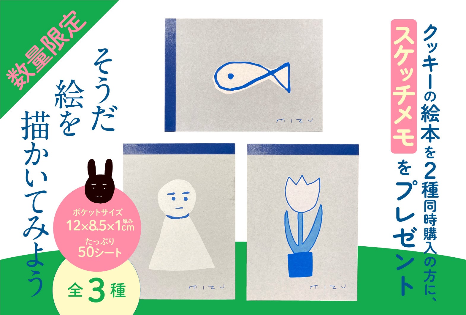 事前予約期間中に2冊セットでご購入いただいたお客様に、安西水丸オリジナルスケッチメモを1冊プレゼントいたします。絵柄は「てるてるぼうず」、「チューリップ」、「おさかな」の3種(たて8.5cm×よこ12cm)。