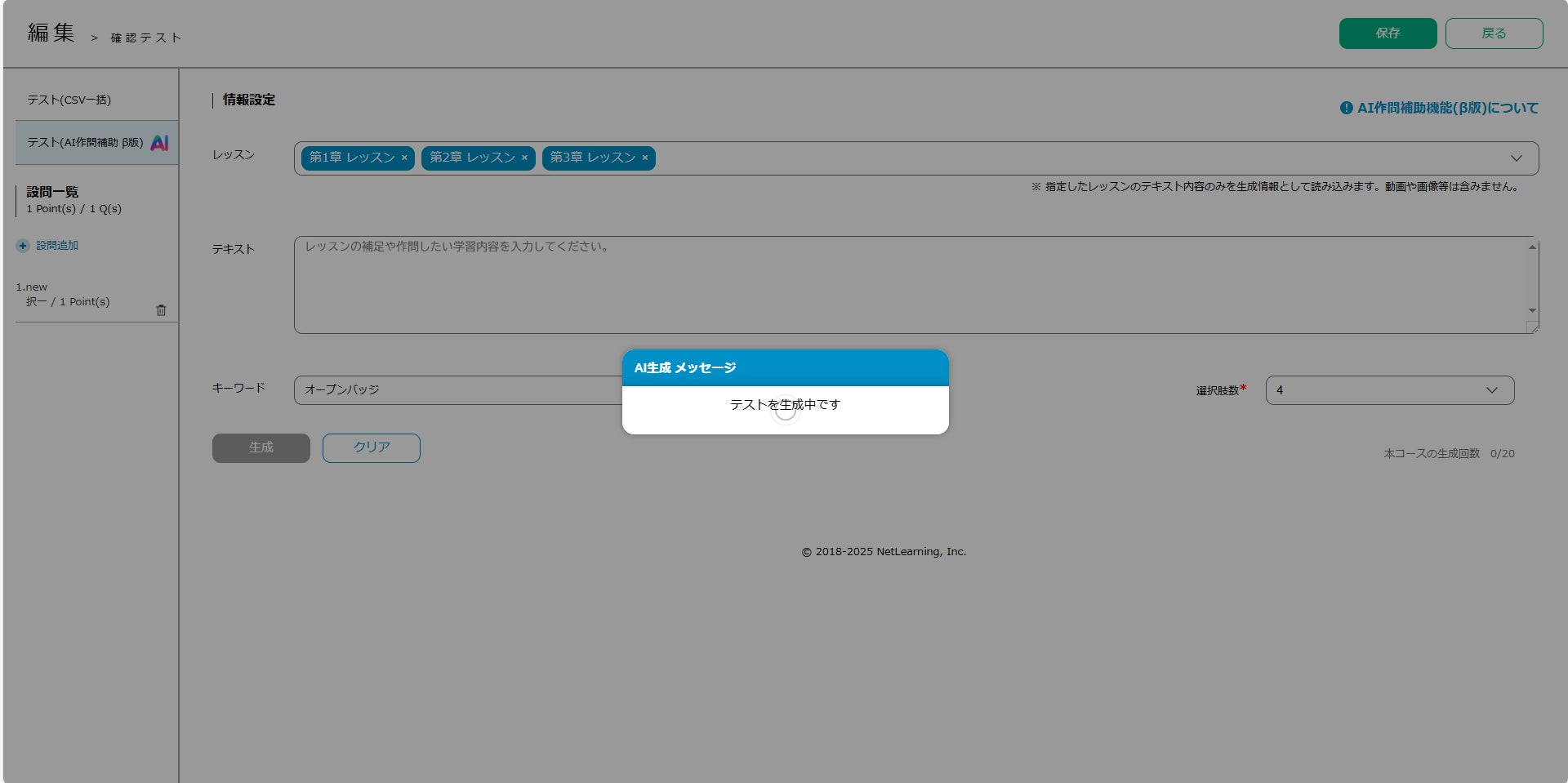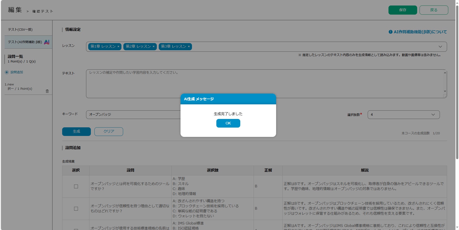 対象となるレッスンや教材情報をAIに指定することで、学習目的に沿った設問が自動で作成されます。これにより、学習内容の理解度向上と定着が期待できます。