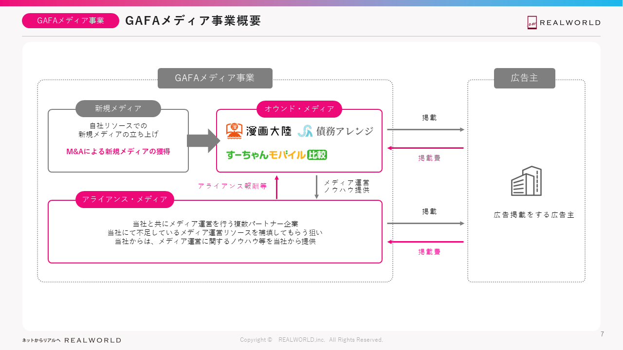 当初、競合性が高く、SEO上の評価も厳しいとされるYMYL領域は買収対象外としておりましたが、GAFAメディア事業におけるメディア・ポートフォリオの拡張を図るべく、今回、事業買収を用いての参入を決定いたしました。今後、取り扱うメディア領域を拡張、収益軸を分散することにより、市況の変化等、外部要因による変動にも左右されにくい強固な事業基盤の構築を目指してまいります。