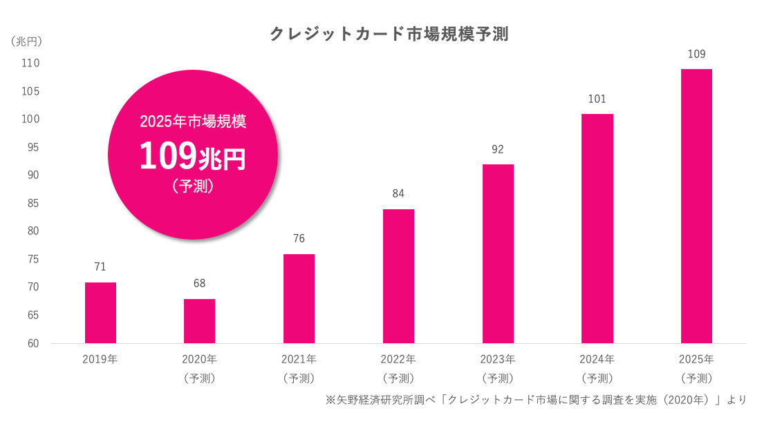上記に紐づき、2021年においては、約76兆円とされていたクレジットカード市場は、2025年には109兆円と約143%の成長を遂げることが予想されています。