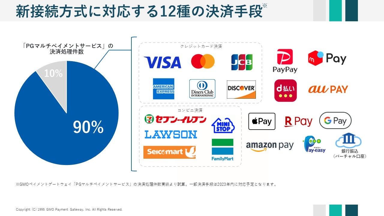 さらに同サービスは、決済処理件数の90%を占める12種類の決済手段に対応しているため、希望する決済手段が選べないことによる消費者の離脱を防ぎ、ECサイトの売上を向上する効果が期待できます。