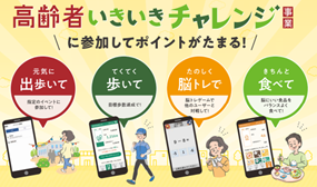 アプリの提示する適切な運動や食事などの健康目標を達成した場合や、市が定めるイベントへ参加して社会参加した場合に“健康ポイント”が付与されます。「高齢者いきいきチャレンジ事業」は、松山市内に住む高齢者の外出機会の創出や健康習慣の定着を図り、高齢者の健康寿命の延伸を目指しております。