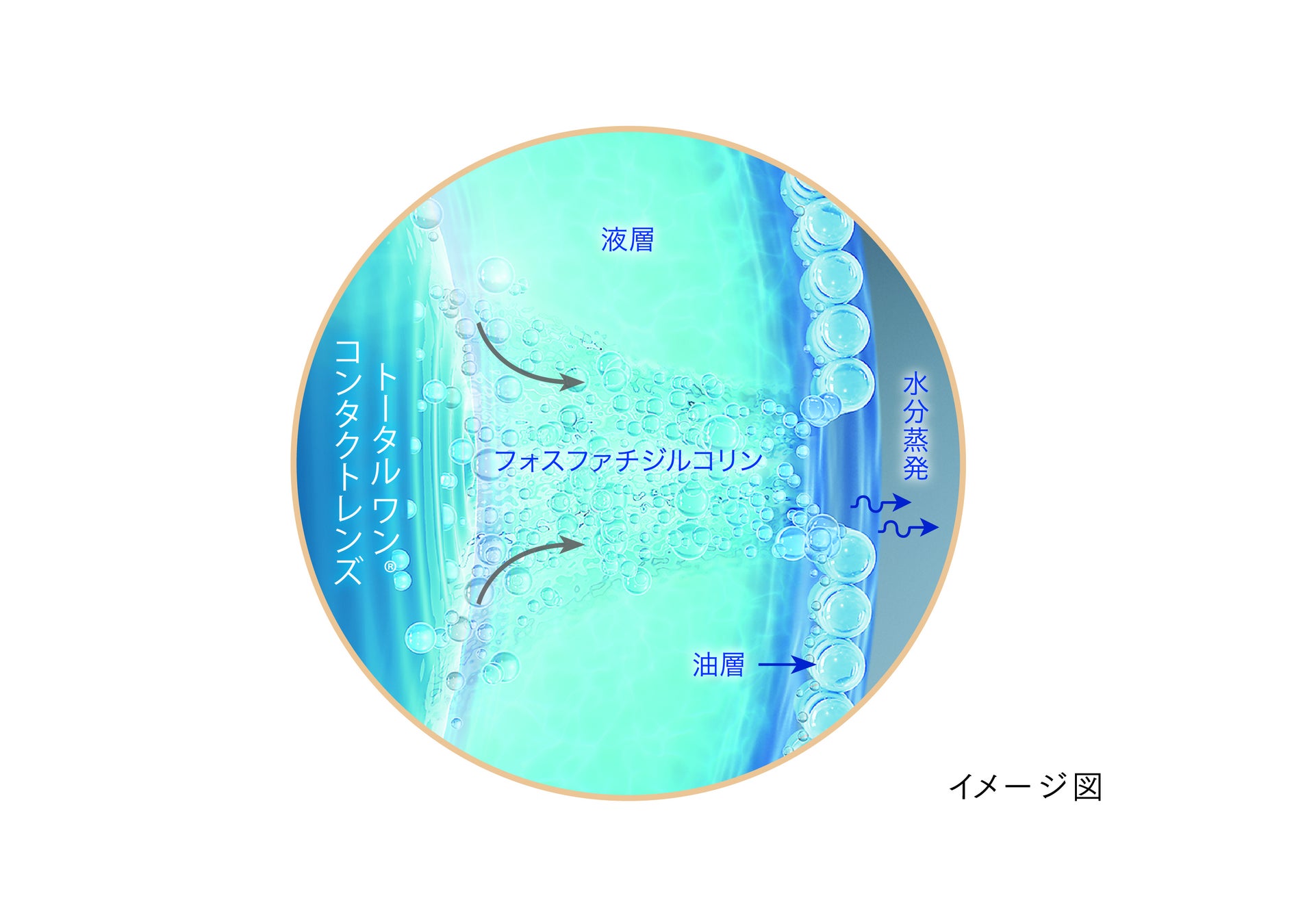 レンズには涙液に含まれている成分「フォスファチジルコリン」を含有し、必要に応じて涙と調和し、涙の蒸発を防ぐサポートをする*4、5、「スマーティアーズTM テクノロジー」を採用しています。これにより長時間つけていてもうるおいを保ちます(注2)。