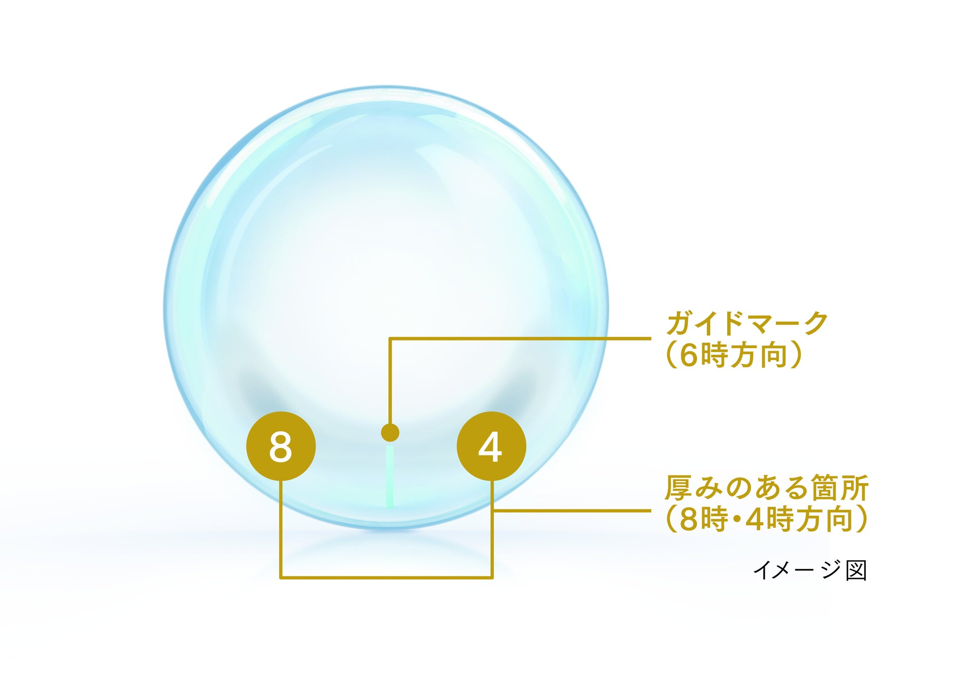 「トータル ワン® 乱視用」は独自のデザイン「プレシジョンバランス8|4TMデザイン」(読み方:プレシジョンバランス エイト バイ フォー デザイン)によって、クリアで安定した見え方(注2)*3を両立します。乱視用コンタクトレンズは、まばたきのたびにレンズが回転してしまうと見え方に影響が出るため、軸の安定性が重要です。「プレシジョンバランス8|4TMデザイン」は8時と4時の方向に厚みを持たせることで軸が安定しやすく、レンズが安定するまで平均37秒、2分後の回転偏位(平均値)が2度以内、96%がまばたき時のレンズ回転揺れが3度未満という結果が出ています*6。