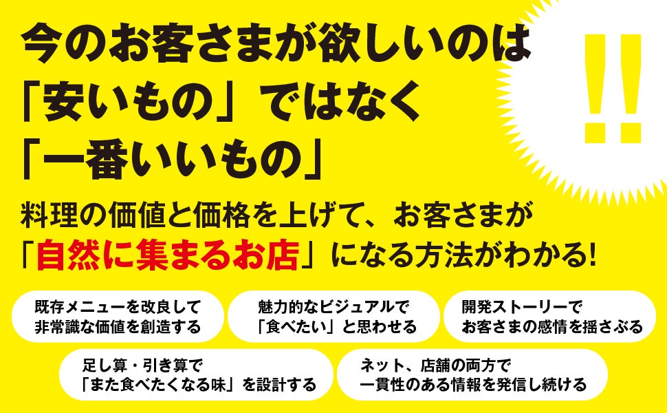多くの飲食店が直面する最大の課題、それは「値上げ」に対する不安です。「値上げをすれば客離れが起きる」「安くしないとリピーターが増えない」などのジレンマに悩む経営者も多いことでしょう。しかし、本書では単なる値上げではなく、「圧倒的な価値」を提供しながら適正価格で販売する方法を詳しく解説しています。