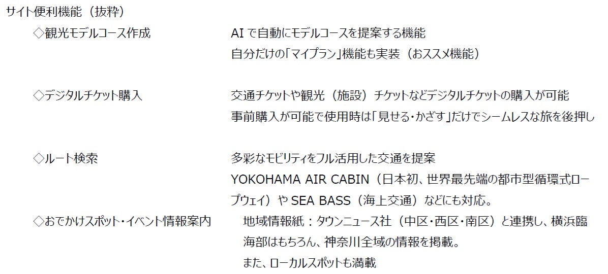 具体的には、観光WEBサイト「アットヨコハマ」上で、当社従来の機能である公共交通サービスの経路案内に加え、カーシェアリングやシェアサイクル・電動キックボードなど多彩なモビリティサービスの活用を可能にし、神奈川県や横浜に訪れた皆様に、より効率的な経路検索を案内する複合経路検索機能とその利用ができるWebページを提供いたします。