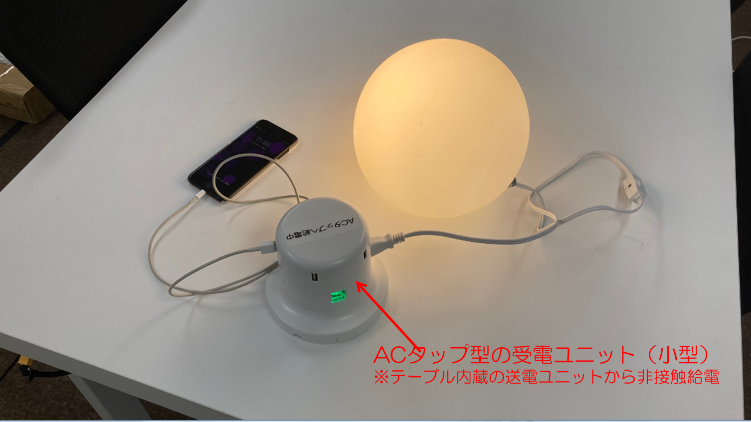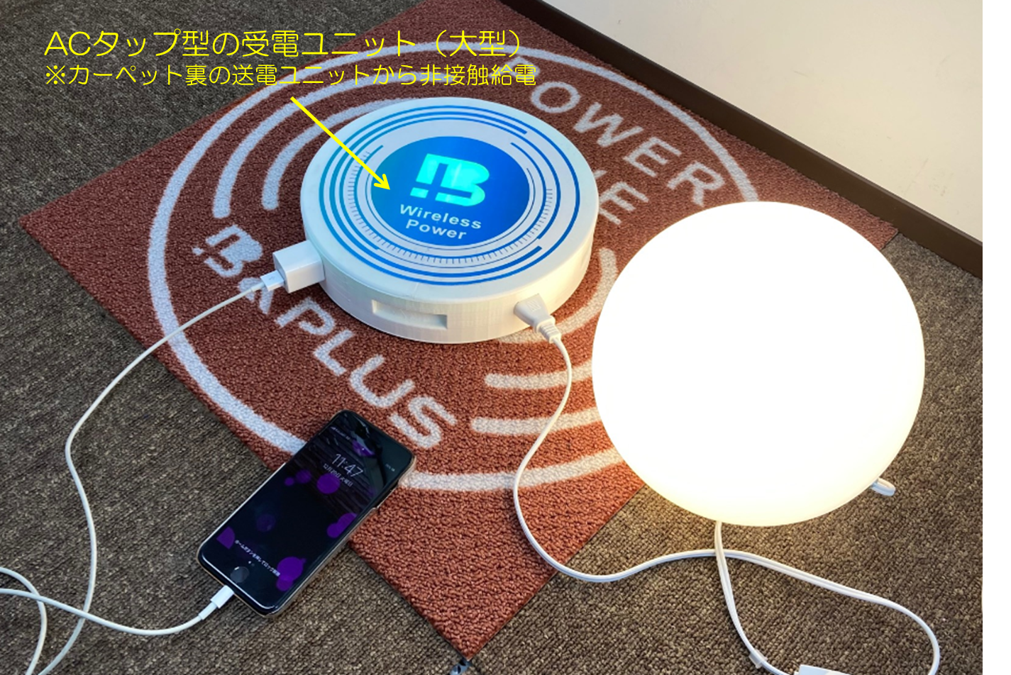 そこで、ビーアンドプラスは、一般的ACコンセントのように駆動ができるACタップ型のワイヤレス給電ユニットのプロトタイプを開発致しました。AC100Vで出力される為、電力の容量が収まれば、一般的なAC駆動機器のコンセントをつなげて、動かす事が可能です。
