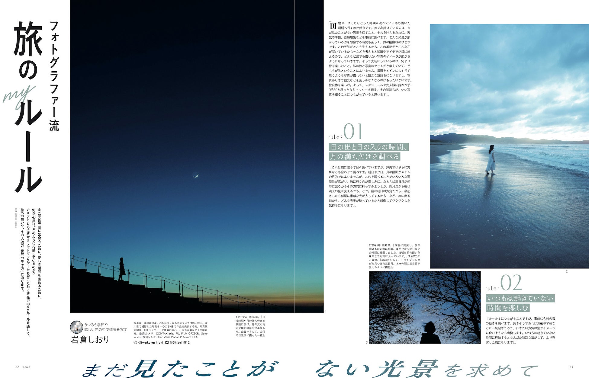 まだ見ぬ光景を求めて、新しい出逢いに期待して、私たちは旅に出ます。どんな時も旅することを諦めず、その想いを持ち続けてきました。ふたたび動き出した時計を止めずに、「いつか」という言葉を捨てて。写真は旅する原動力。今すぐカメラを持って、日本へ、世界へ。約2年ぶりの旅写真特集。写真家、表現者たちそれぞれの「旅のフレーム」をたっぷりとお届けします。