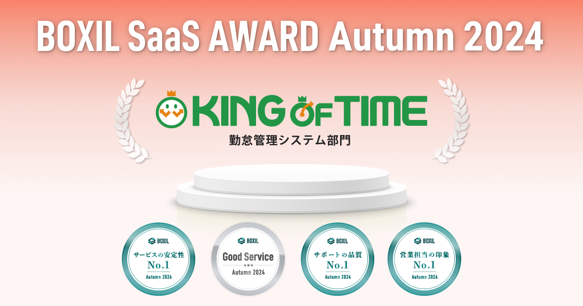 「BOXIL SaaS AWARD(ボクシル サース アワード)」は、SaaS(※1)比較サイト「BOXIL SaaS(ボクシル サース)」を運営するスマートキャンプが、優れたSaaSを審査、選考、表彰するイベントです。今回の「BOXIL SaaS AWARD Autumn 2024」は、2023年7月1日〜2024年6月30日までの1年間に「BOXIL SaaS」上へ新たに投稿された口コミ約16,000件をもとに審査しています。「KING OF TIME」は勤怠管理システム部門にて「Good Service」「サポートの品質No.1」「営業担当の印象No.1」「サービスの安定性No.1」の4つの賞を受賞いたしました。「サービスの安定性No.1」につきましては、今回が初受賞となります。