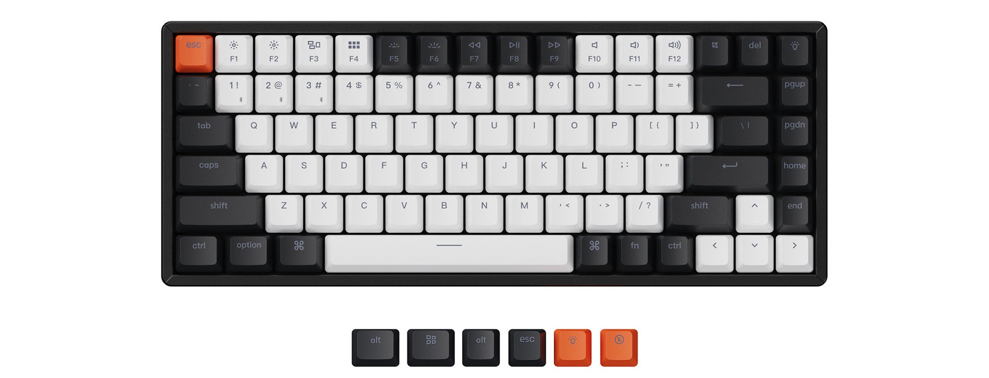 Mac、Windows、iOS、Androidなど、すべてのOSに対応しています。K2は、Macレイアウトのメディアキーを搭載した数少ないメカニカルキーボードです。これにより、従来のmacOSと同じメディアキーをすべて使用することができます。すべてのK2キーボードには、Mac用とWindows用にそれぞれ3つの専用キーキャップが付属しています。