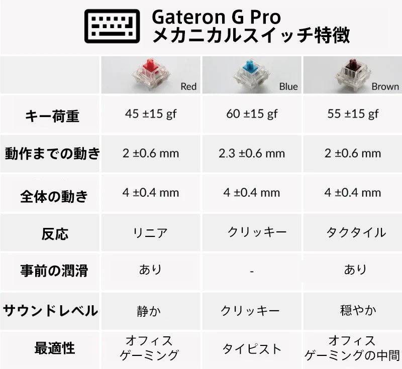 K2は、Gateron G Proメカニカルスイッチを搭載しています。全てはより良いタイピング・エクスペリエンスのためです。リニア、クリッキー、その中間など、お好みに合わせて、3種類のGateronスイッチ(赤軸、青軸、茶軸)をご用意しました。最大5,000万回のキーストローク寿命により、心地よい打感を長期に渡って実現します。