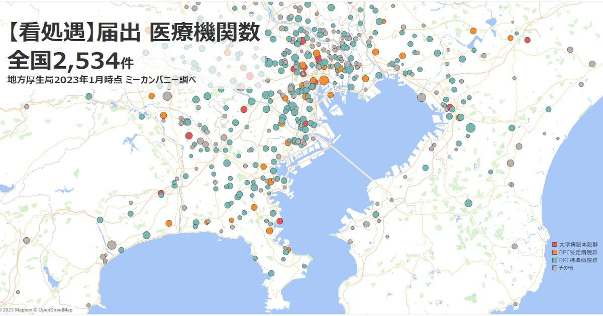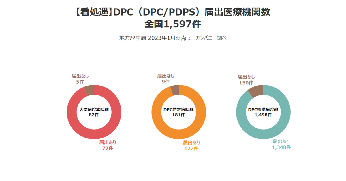 ミーカンパニー株式会社(本社:東京都港区、 代表取締役:前⽥ 健太郎 以下「当社」)は、保険医療機関の様々な情報を収集し、⾼いクレンジング技術でデータベース化しています。2022年10⽉より新設された「看護職員処遇改善評価料」について、届出状況を調査しました(2023年1⽉調査時点 石濱)