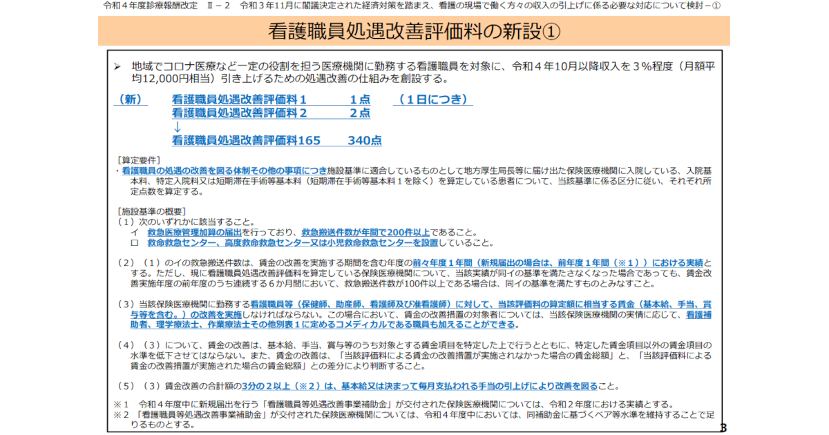 看処遇の評価料の新設は、確実に看護職員の賃上げにつなげることが基本命題であるため、今後は実際にどれほどの賃金引き上げにつながったかの検証が求められるほか(2022年7月27日 中央社会保険医療協議会 総会 第525回議事録より引用)、日本看護協会は、救急医療を担う医療機関以外も含めた全ての看護職員の処遇改善への要望を出すなど、より公平性が実現できる形での継続・拡大が期待されます。