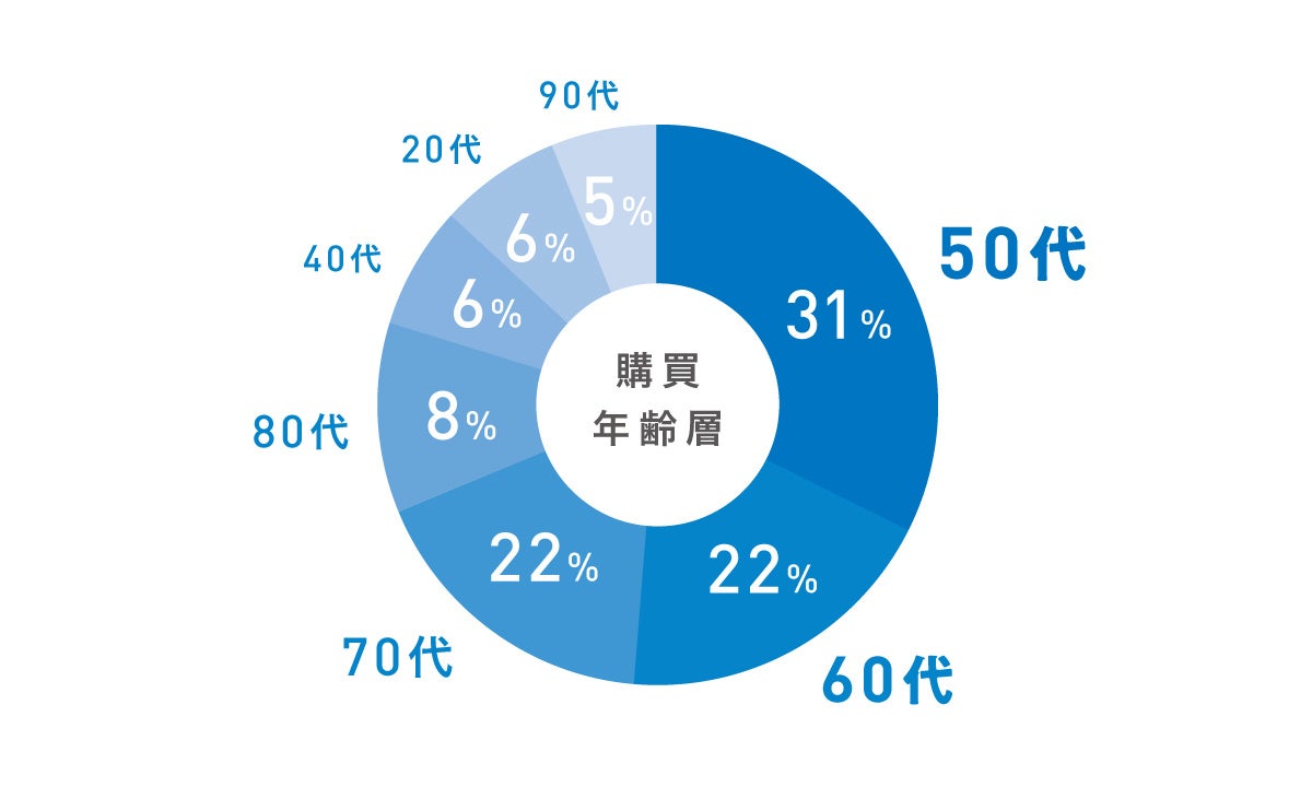 また、幅広い年齢層にご購入いただいており、最も多いのは50代でした。これに60代と70代が続き、比較的若い年齢層の方の購買も多いことが分かります(注2)。