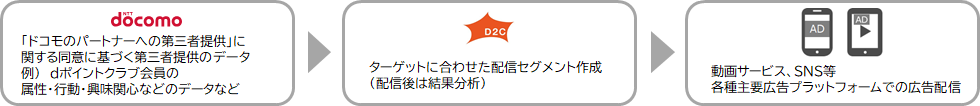 株式会社D2C(本社:東京都港区、代表取締役社長:高田 了、以下「D2C」)は、株式会社NTTドコモ(以下「ドコモ」)から第三者提供に同意されたユーザーデータ(広告識別子・属性情報・位置情報・行動履歴など)の提供を受け、ドコモが運営するポータルサイト、ニュースアプリ、メールアプリなどのドコモメディア以外の各種主要広告プラットフォームでの広告配信を開始いたします。本件については株式会社D2C R(本社:東京都港区、代表取締役社長:豊永 雅史、以下「D2C R」)が販売代理店として広告主様への販売を開始いたします。