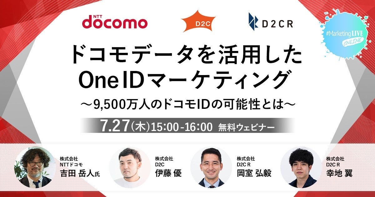 この度D2Cと本広告配信の販売を担当するD2C Rは共同で、この広告配信に関する情報を含む ウェビナー「#MarketingLIVE ドコモデータを活用したOneIDマーケティング ~9,500万人のドコモIDの可能性とは~」を2023年7月27日(木)15:00より開催いたします。