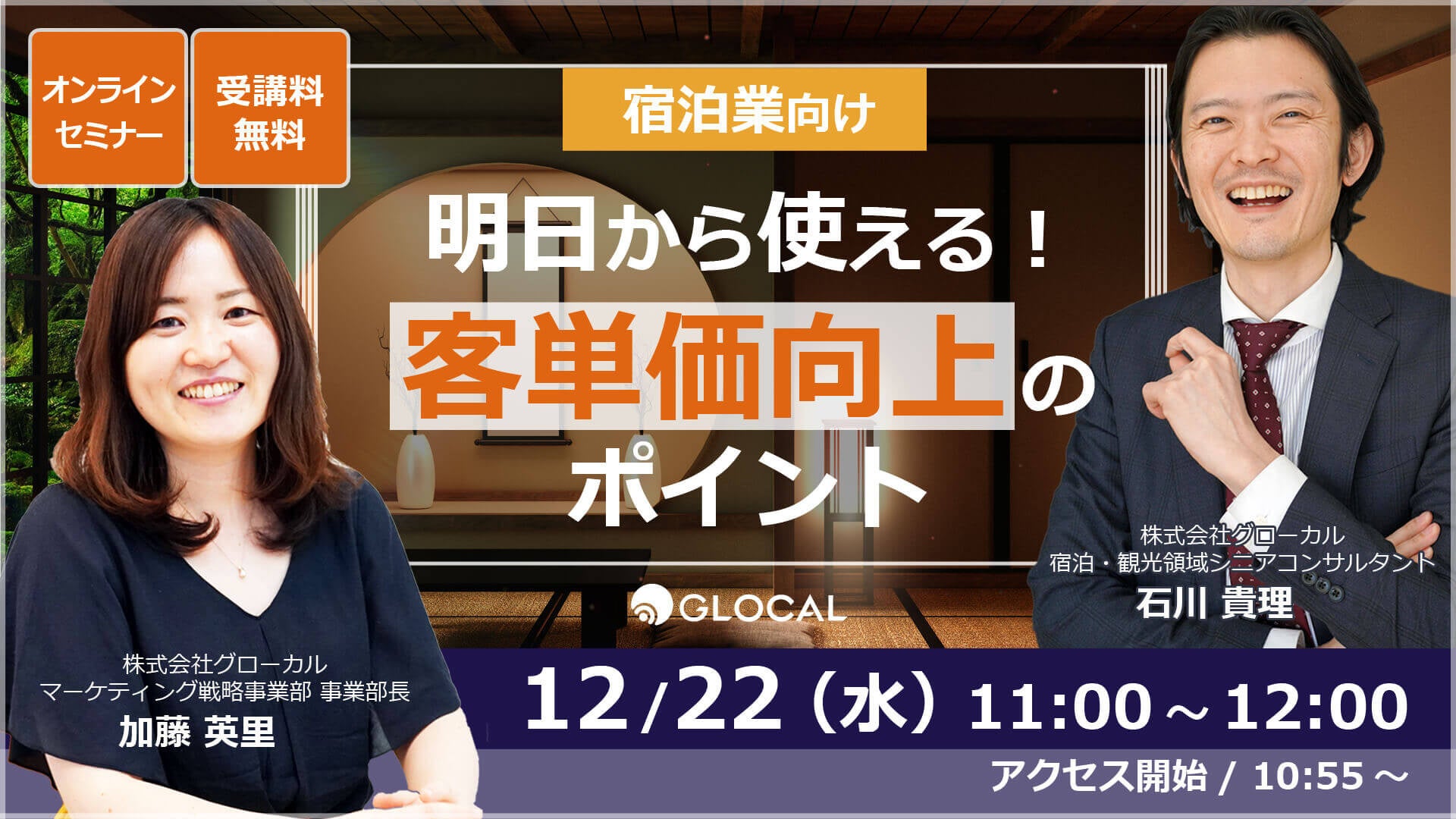 地域の中小・中核企業を対象に経営コンサルティング事業を行う株式会社グローカル(東京都渋谷区、以下グローカル)は、宿泊施設の経営者・集客責任者を対象に、アフターコロナにおいて取り組みたい集客方法やオペレーション改善のポイントを解説する無料オンラインセミナーを、2022年9月6日(火)14:00から開催します。今回は、SaaSサービスで宿泊業界のDXを推進するXXX(エイジィ)株式会社マーケティング責任者の倉片真之介氏をお招きし、具体的な事例を交えながらお話しいたします。