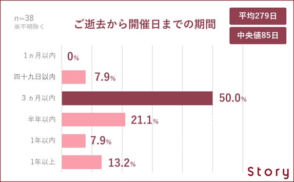平均日数は前回の209日よりも+67日と大きく増加しているように見えますが、調査対象の中には最長でご命日から4,368日(約12年)の期間を経て開催した例も含まれ、中央値で見ると85日と、前回の130日よりも45日ほど開催までの日数が短縮されていることがわかります。