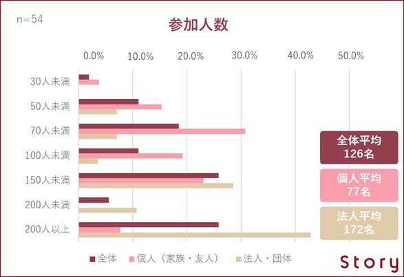 法人は100~150名の中規模もしくは200人以上の中~大規模が多く、個人開催は50~150人未満の中規模が中心。個人で最も多いのは50~70人未満の規模で30.8%となりました。