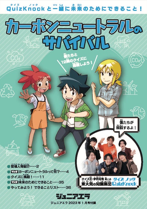 株式会社baton(東京都品川区、代表取締役 衣川洋佑)が運営するQuizKnockと株式会社朝日新聞出版(東京都中央区、社長 市村友一)の「科学漫画サバイバル」シリーズがコラボしたスペシャルブック「カーボンニュートラルのサバイバル QuizKnockと一緒に未来のためにできること!」が、12月15日(木)発売「ジュニアエラ1月号」の付録として刊行されます。漫画やクイズを通してカーボンニュートラルについて楽しく学べる内容となっています。