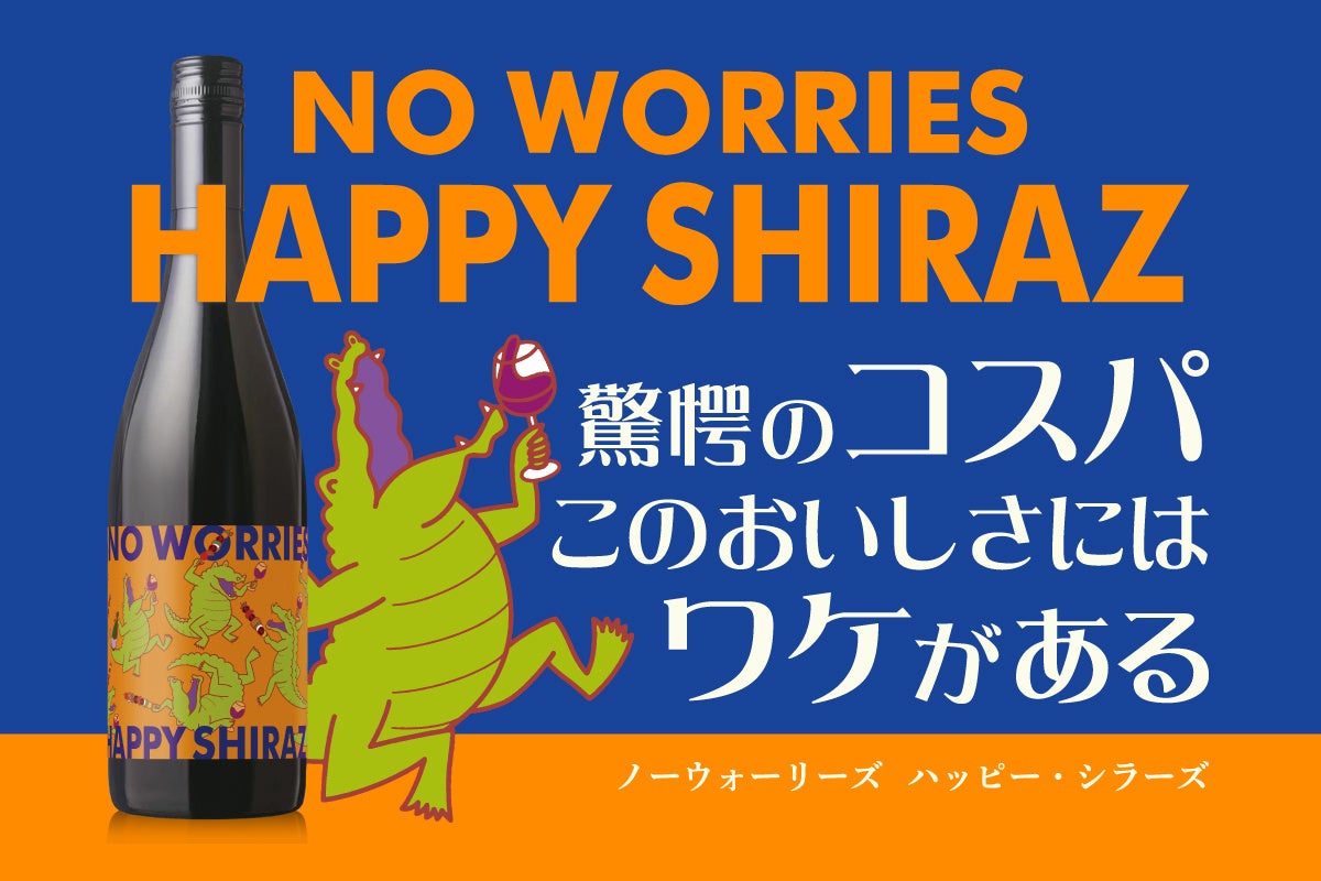 ブランド名はオーストラリアのスラング「No Worries, mate!」(心配ないさ!)から採用。ワインを明るく楽しいものだと感じていただきたいため、ワイン名は品種名だけの味気ないものではなく「HAPPY SHIRAZ」と命名しました。