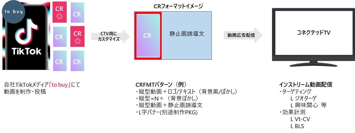本メニューではTikTokでバズるための勝ちパターンノウハウを日々分析・検証し、安定的にバズり投稿を生み出している当社運営メディア「「to buy」公式TikTokアカウント(https://www.tiktok.com/@tobuy_desu)で商品紹介をし、バズった縦型動画クリエイティブをコネクテッドTV広告のフォーマットに変換し、広告を配信いたします。