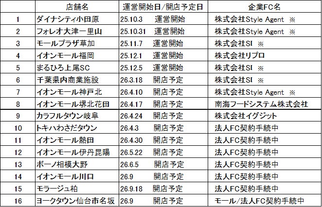 法人FCは好スタートをきりました。26年は法人FC用のモール店を11店契約済みです。出店契約済みの11店とも法人FCとFC契約済みか契約手続き中(契約書のリーガルチェック中が多い)です。これで法人FCは 10社、16店舗(うち、5店は運営中)になります。10社で全国をほぼカバーできます。なお、法人FC店舗の詳細は下記です。