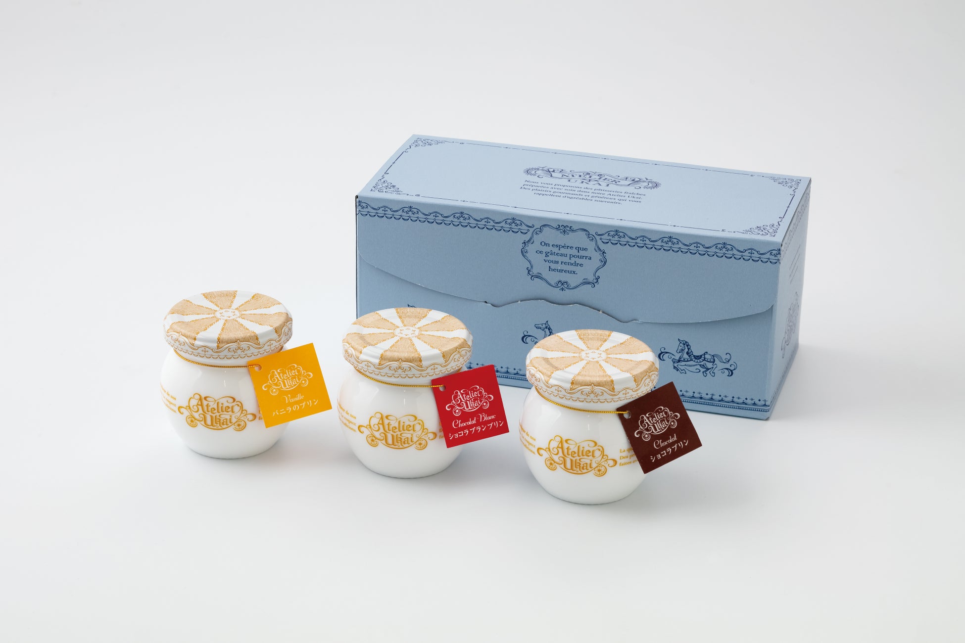口の中でとろける食感や素材の繊細な風味をお楽しみいただける、アムール・デュ・ショコラ限定のプリン3個セット。お味は定番「バニラのプリン」、自家焙煎した香ばしいカカオの風味が楽しめる「ショコラプリン」。そしてジェイアール名古屋タカシマヤ限定の「ショコラブランプリン」をご用意しました。