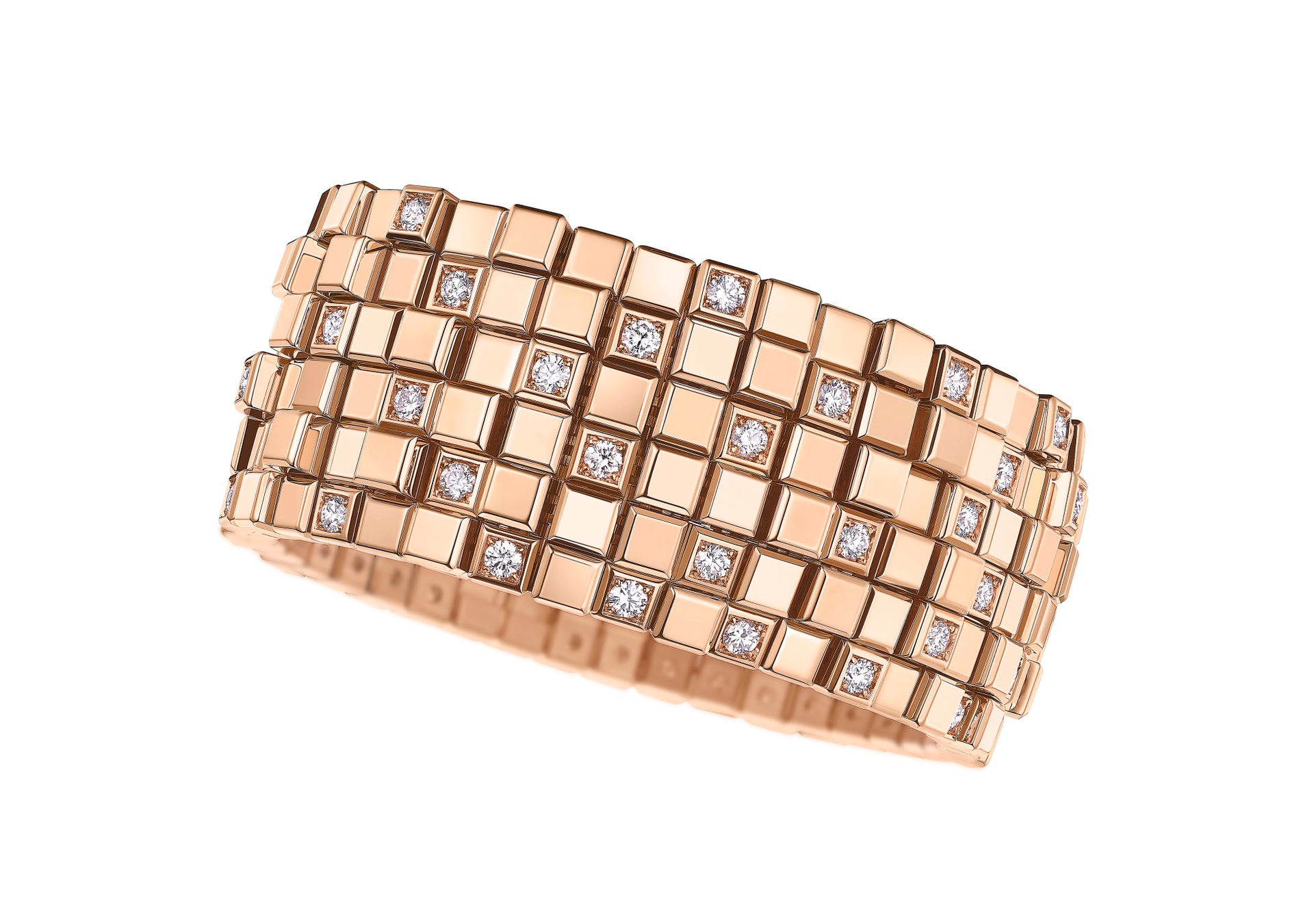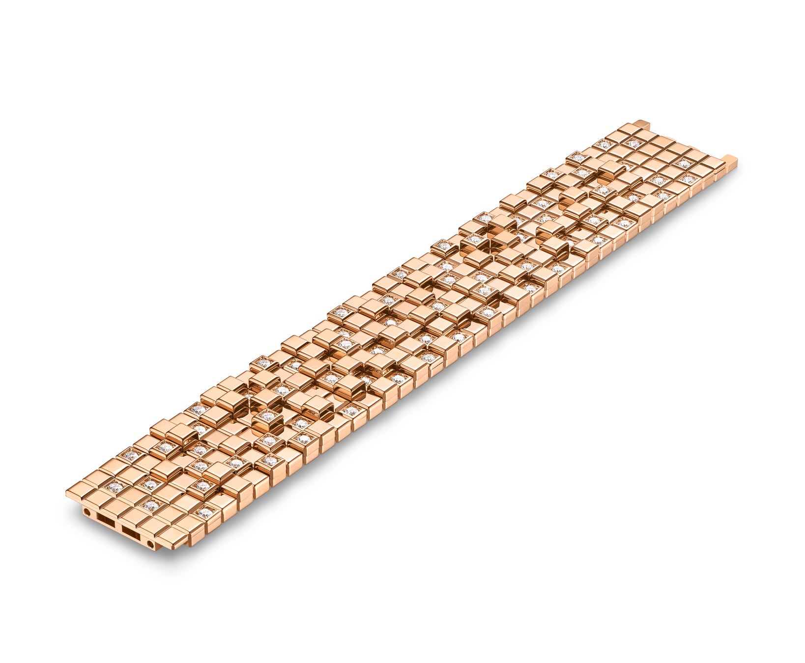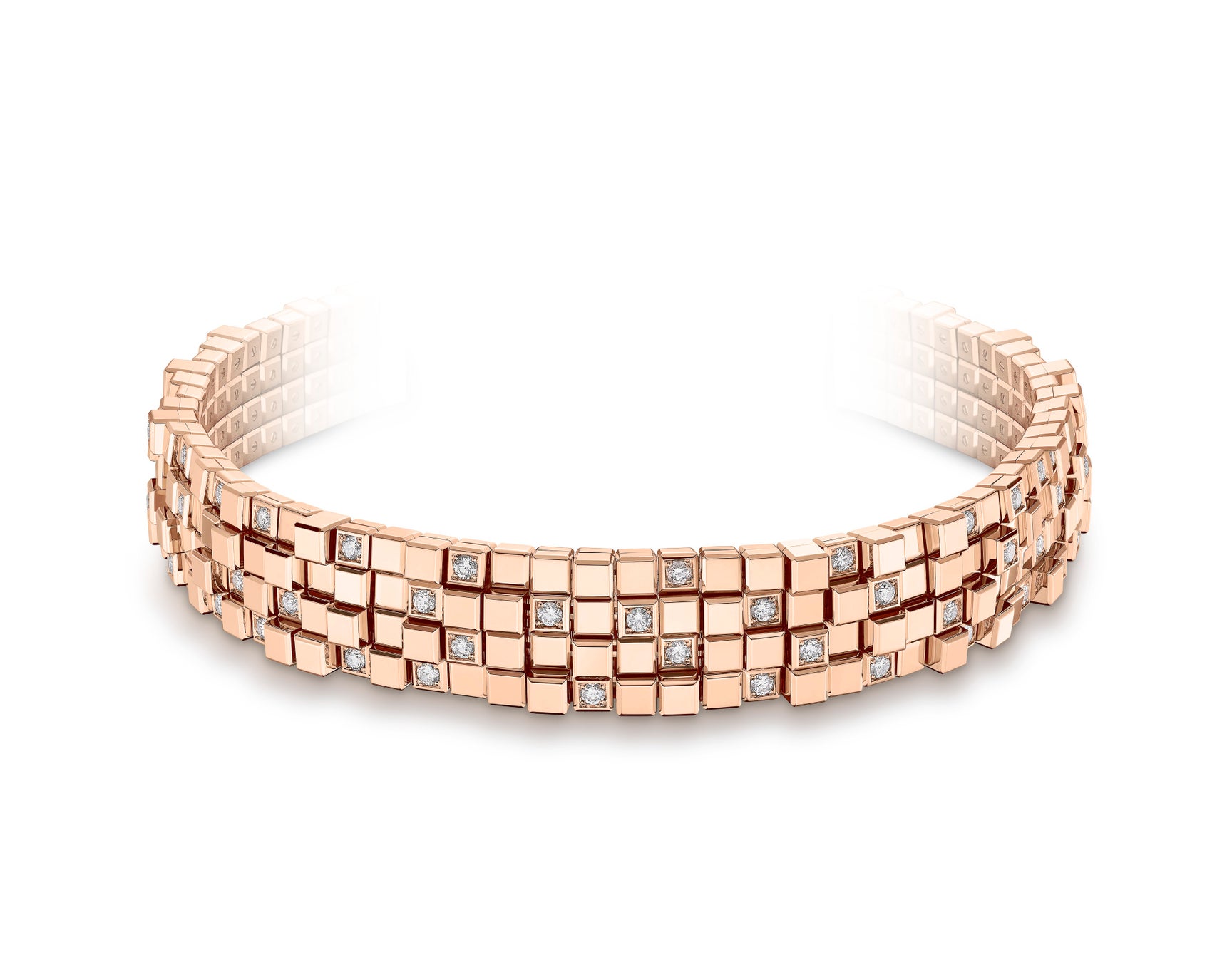 巧みな連結構造のデザインによって、キューブは柔軟なニットのように織り成し、身体の動きに合わせて肌にぴったりとなじみます。このしなやかさにより、ジュエリーピースに官能的な特徴が宿ります。ジュエリーとそれを身につける人が一体と化し、それが完全な共生へと進化を遂げ、グラマラスなオーラを幾倍にも高めます。これこそが、ショパールのハイジュエリーアトリエが長年にわたって培ってきたサヴォアフェールの賜物なのです。