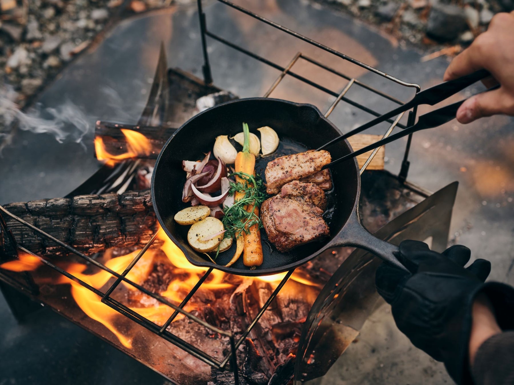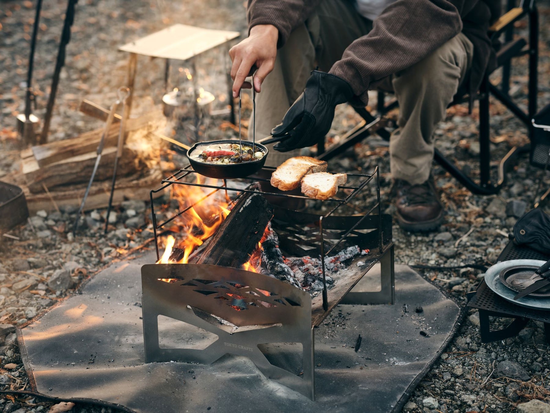 これまで2段階だったゴトクに中段の高さが追加され3段階に調節できる設計に。火床の距離により火力を調節することができ、焚き火料理をさらに充実させます。また焼き台パーツに改良を加え、すこし内側に歪めることで、焼き台の取り外しが可能になります。