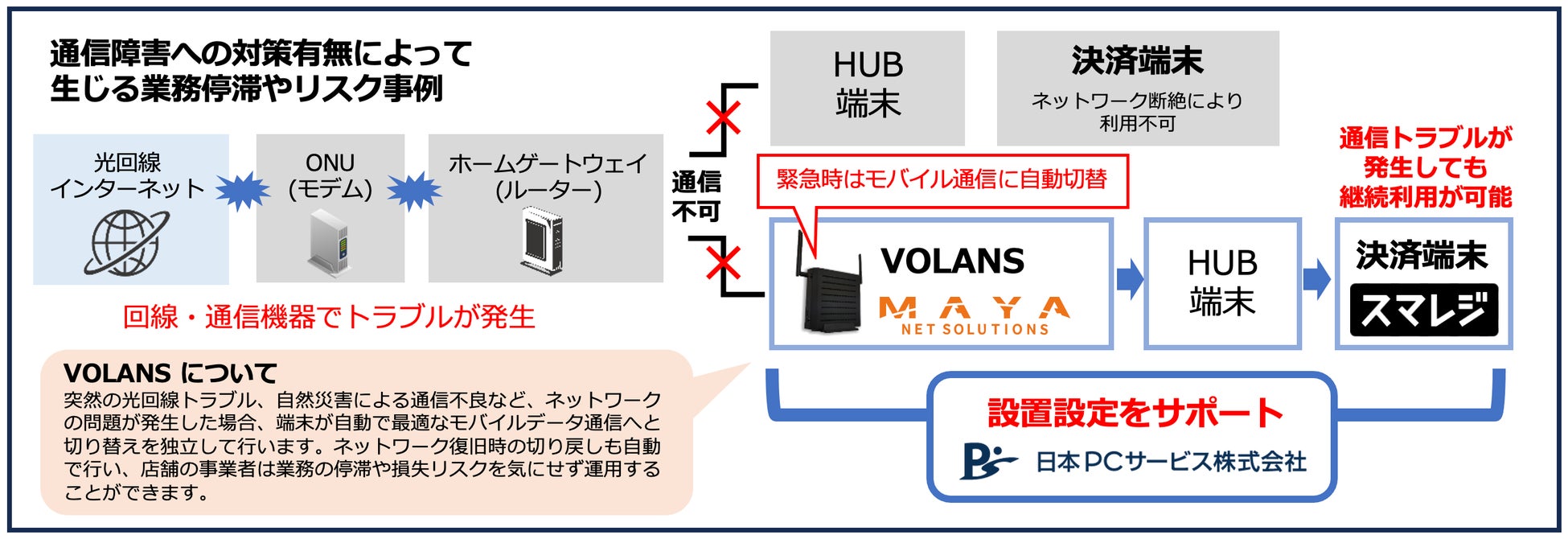 こうした背景から、店舗運営においてネットワークの重要度は急激に高まっています。予期せぬ通信障害により、店舗の決済システムや業務用機器が利用できないケースがニュースで取り上げられることもあり、ネットワークトラブルは店舗運営や社会全体に甚大な影響を与えます。そこでネットワークトラブルへの備えとして、通信障害時にも店舗でのインターネット利用を可能にするMAYAネットソリューションズのVOLANSを使った「ネットあんしんBOX」をスマレジ導入店舗へ提供し、当社の全国サポートインフラを活用して、専門的な知識を有する設置設定作業を行うことで、導入のハードルとなる店舗の手間や負担を取り除き、通信障害時にも店舗運営を止めないサービスを三社で実現しました。
