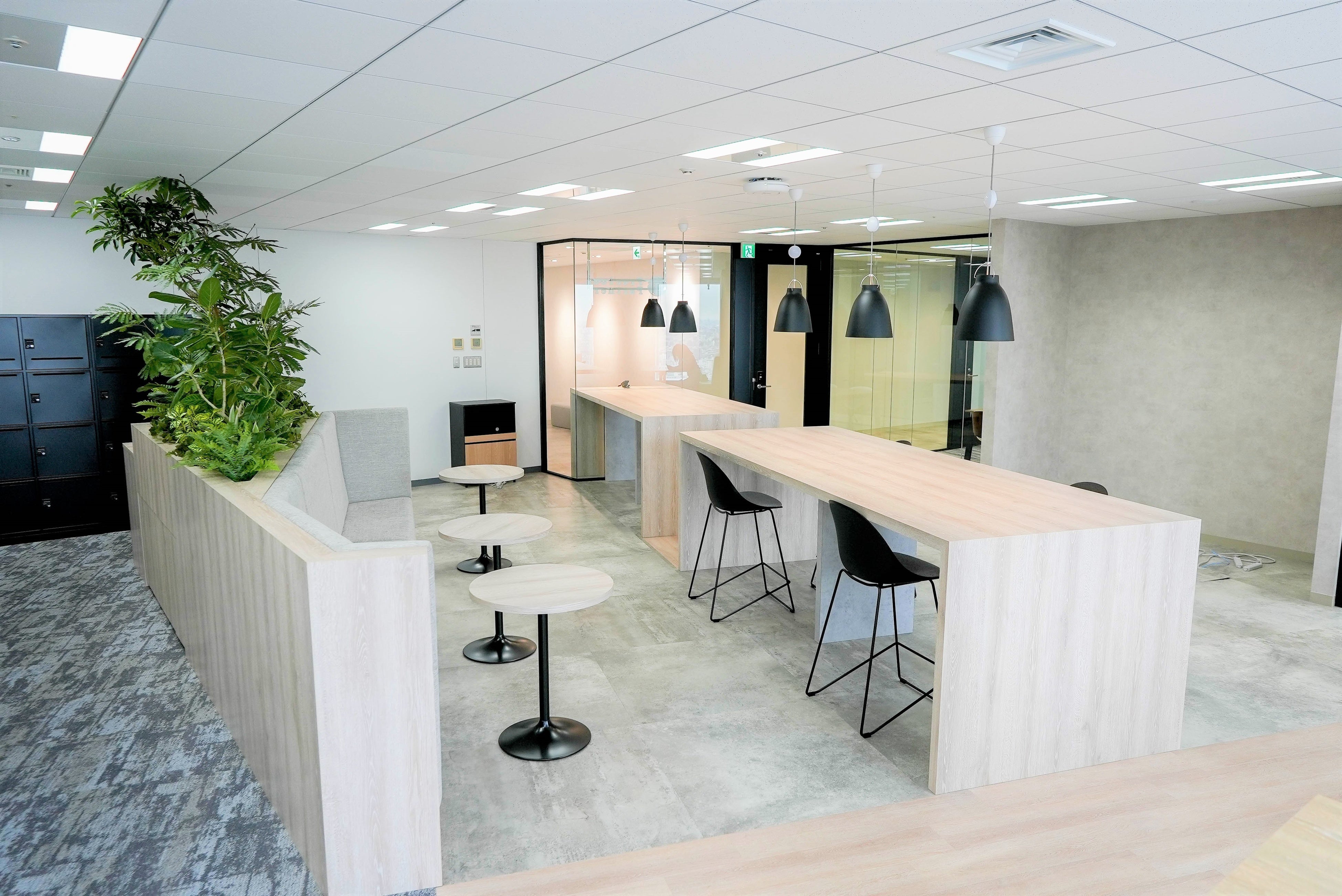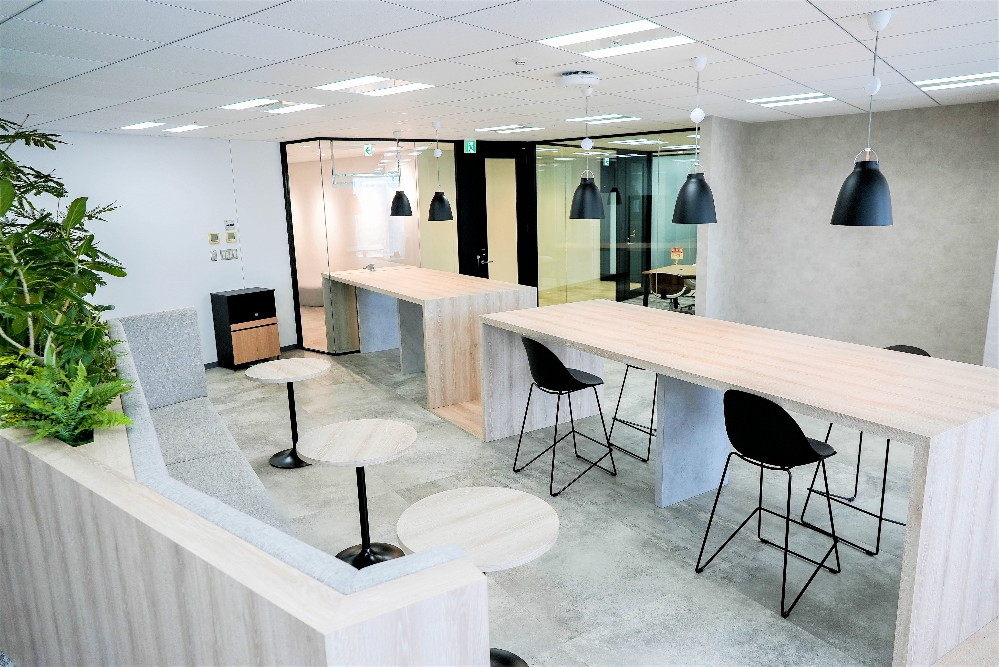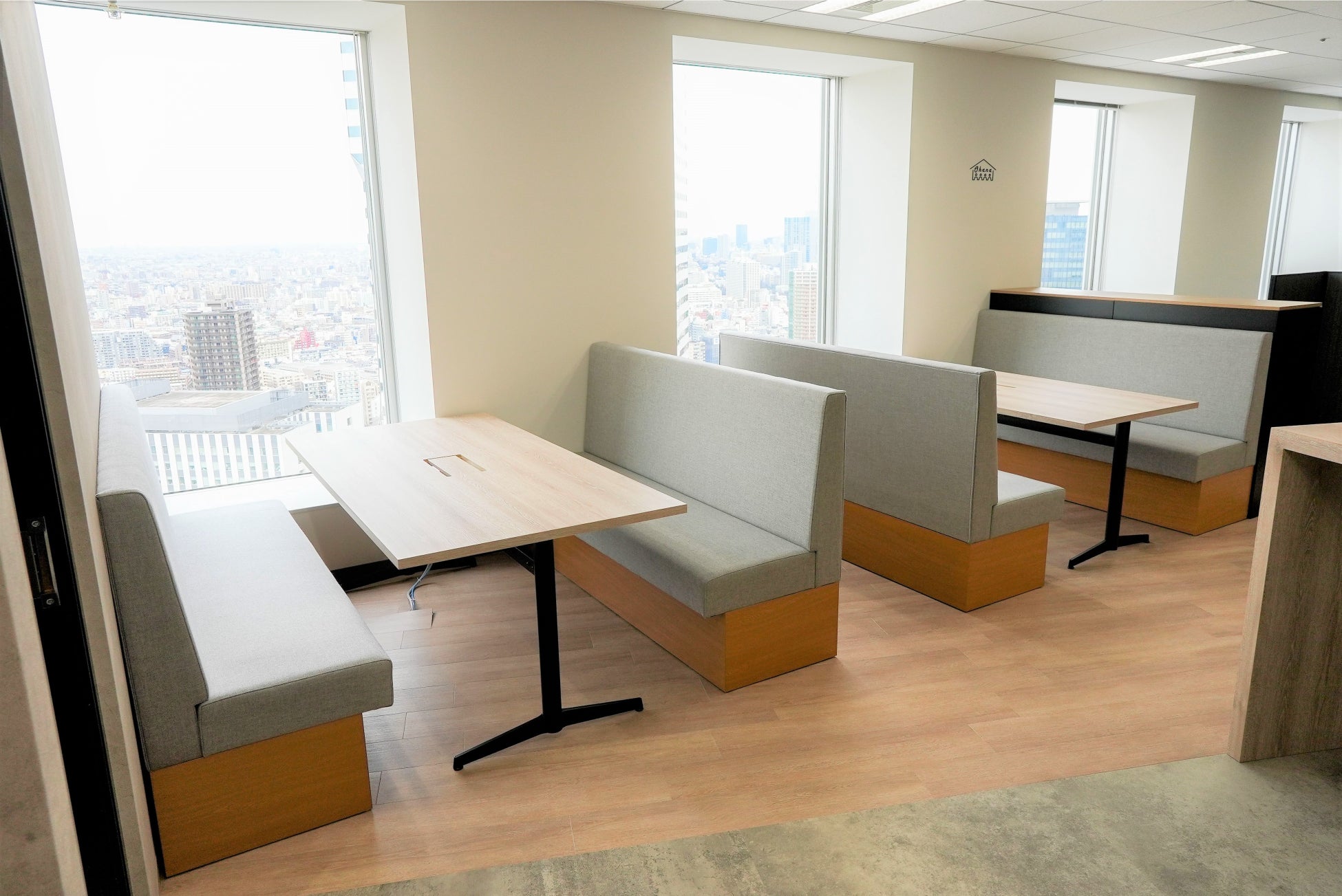 新オフィスは“西海岸風”をコンセプトとし、メンバーが生産性を高めながらリラックスして快適に働くことができる環境をつくりました。まさに西海岸のリゾート地のような開放感のある雰囲気が感じられる明るいオフィスとなっています。ラウンジスペースは、高層ビルからの景色を間近に感じながらコミュニケーションがとれるよう、窓の横際に設置しました。
