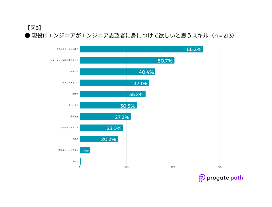 続いて、現役ITエンジニア213人を対象に、ITエンジニア志望者に身につけておいて欲しいスキルを複数回答で聞いたところ、半数以上が「コミュニケーション能力(66.2%)」「ドキュメントを読み書きする力(50.7%)」と回答し、コーディングよりもチーム開発などを考慮したスキルを重視している結果となった。