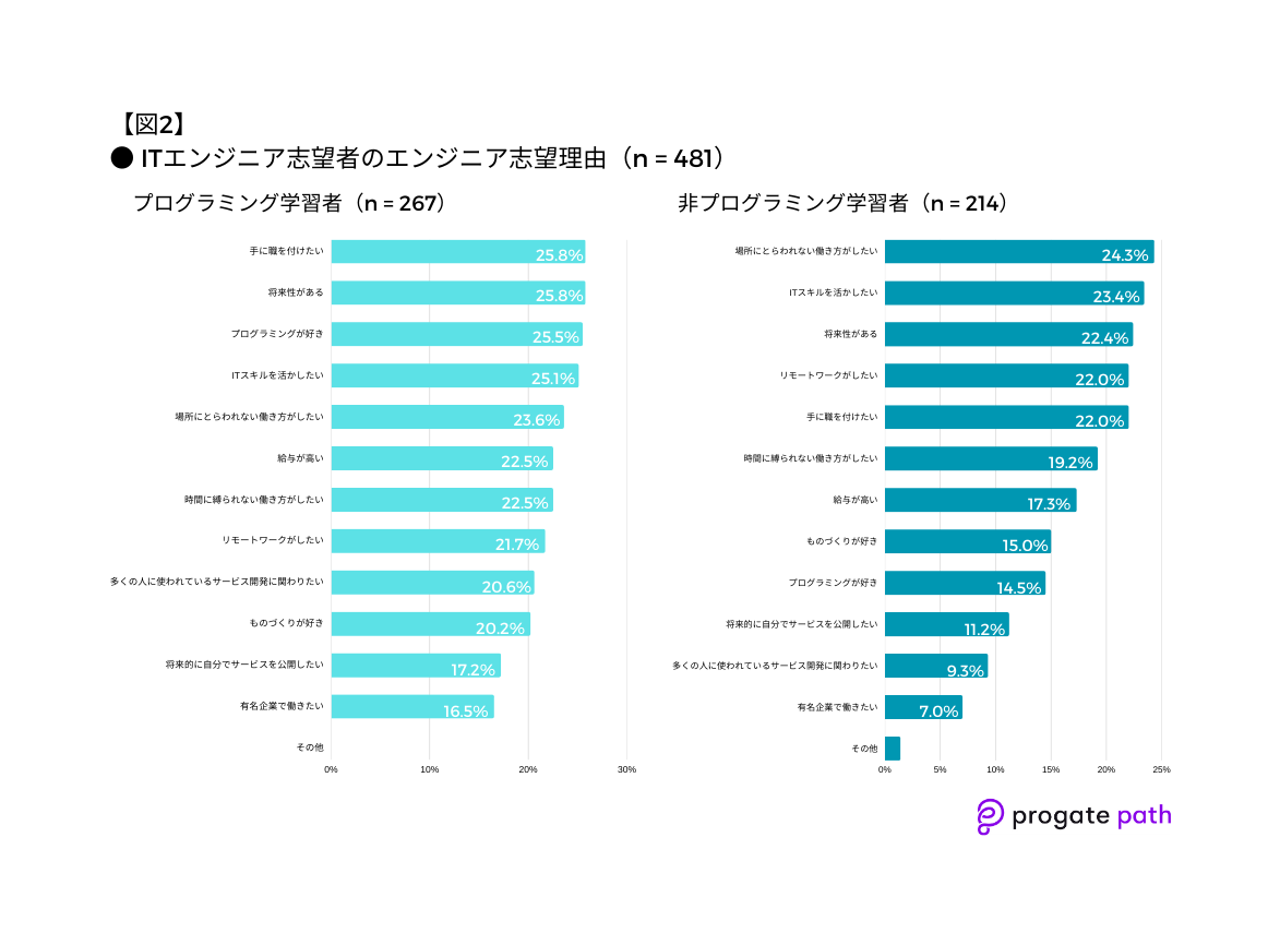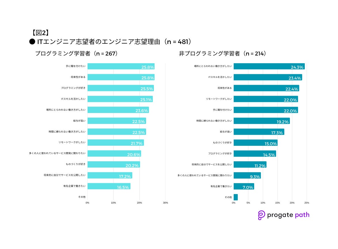 次に、「エンジニアへの就職・転職を目指している」と回答した481人を対象に、ITエンジニアを志望する理由を複数回答で聞いたところ、プログラミング学習者では「手に職をつけたい(25.8%)」「将来性がある(25.8%)」「プログラミングが好き(25.5%)」、非プログラミング学習者では「場所にとらわれない働き方がしたい(24.3%)」「ITスキルを活かしたい(23.4%)」「将来性がある(22.4%)」がそれぞれ上位3位となった。