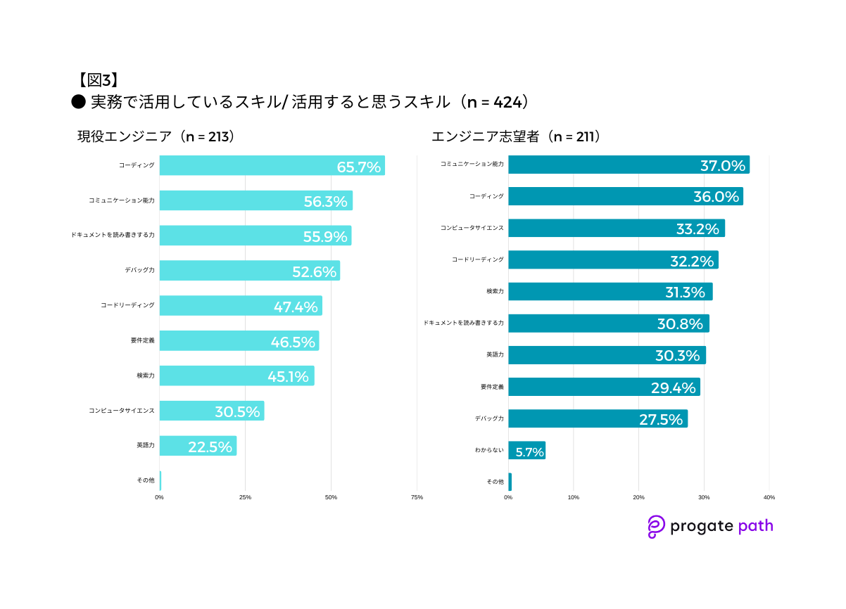 日々の実務において、現役ITエンジニアに「ITエンジニアとして活用しているスキル」、ITエンジニア志望者に「ITエンジニアが活用すると思うスキル」を複数回答で聞いたところ、上位3つはITエンジニアが「コーディング」、「コミュニケーション能力」、「ドキュメントを読み書きする力」となり、ITエンジニア志望者が「コミュニケーション能力」、「コーディング」、「コンピュータサイエンス」となった。