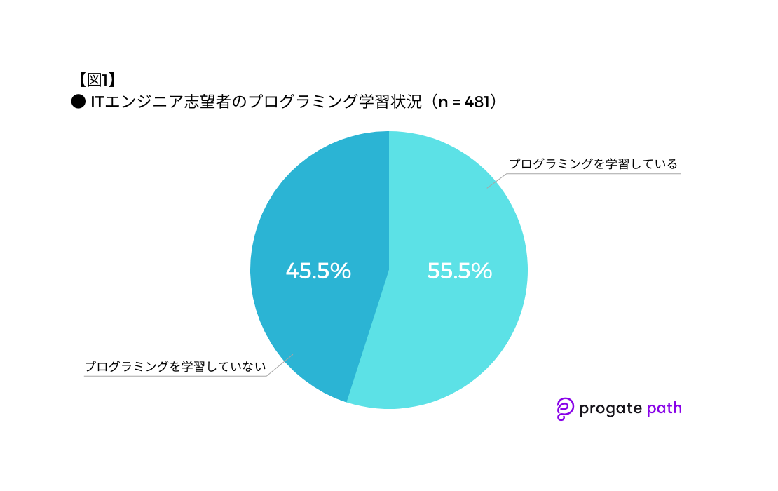 ITエンジニアを目指している人のうち、プログラミングを学んでいるのは55.5%。約半数がプログラミングを学ばずに目指している結果に。