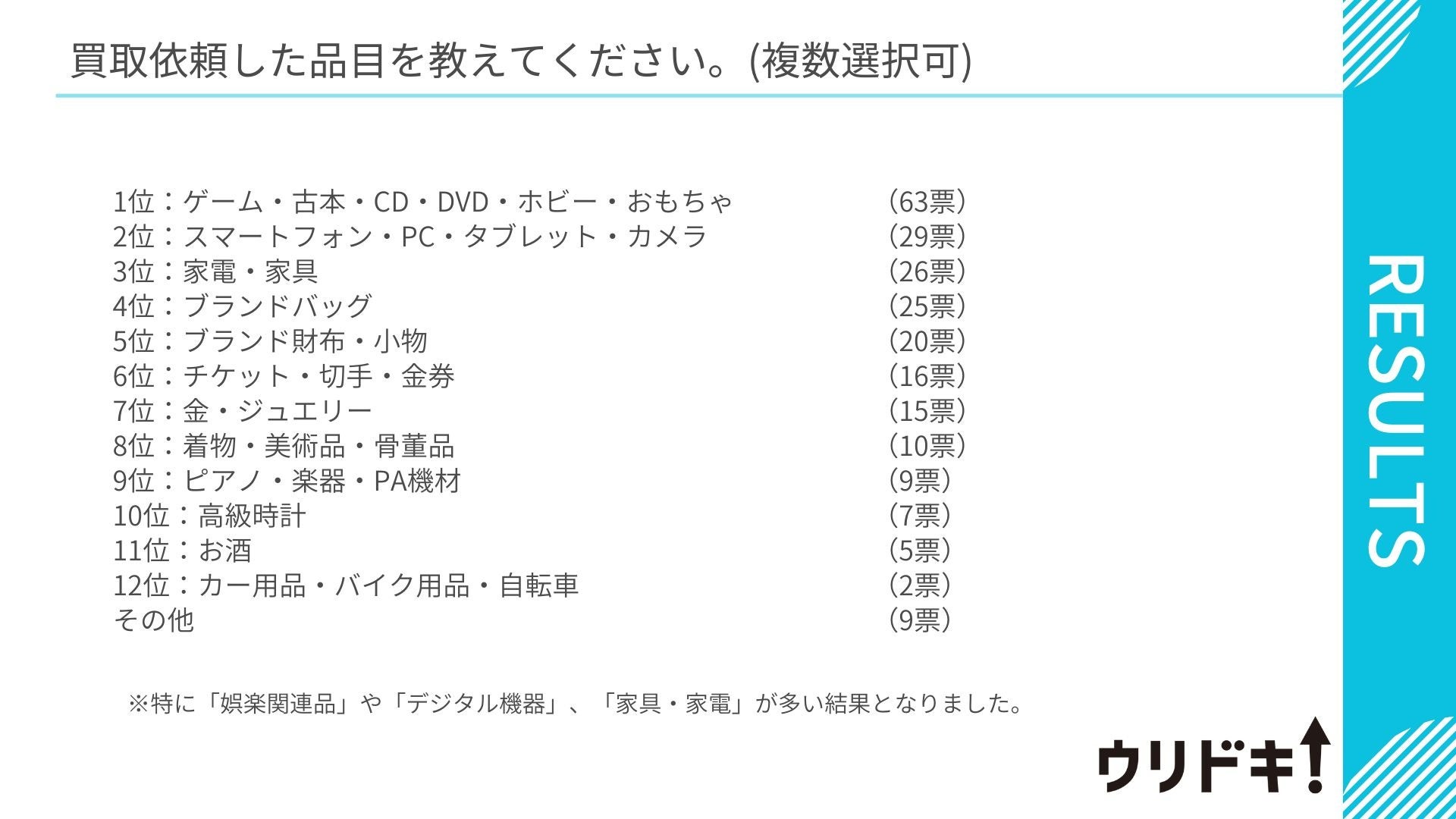 買取依頼品目について、「娯楽関連品」「デジタル機器」の順に多い結果となりました。