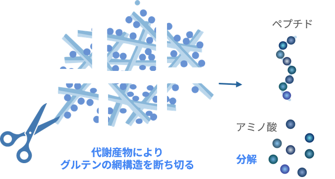 グルテン分解乳酸菌の代謝産物によりグルテン網構造を断ち切り分解するイメージ図