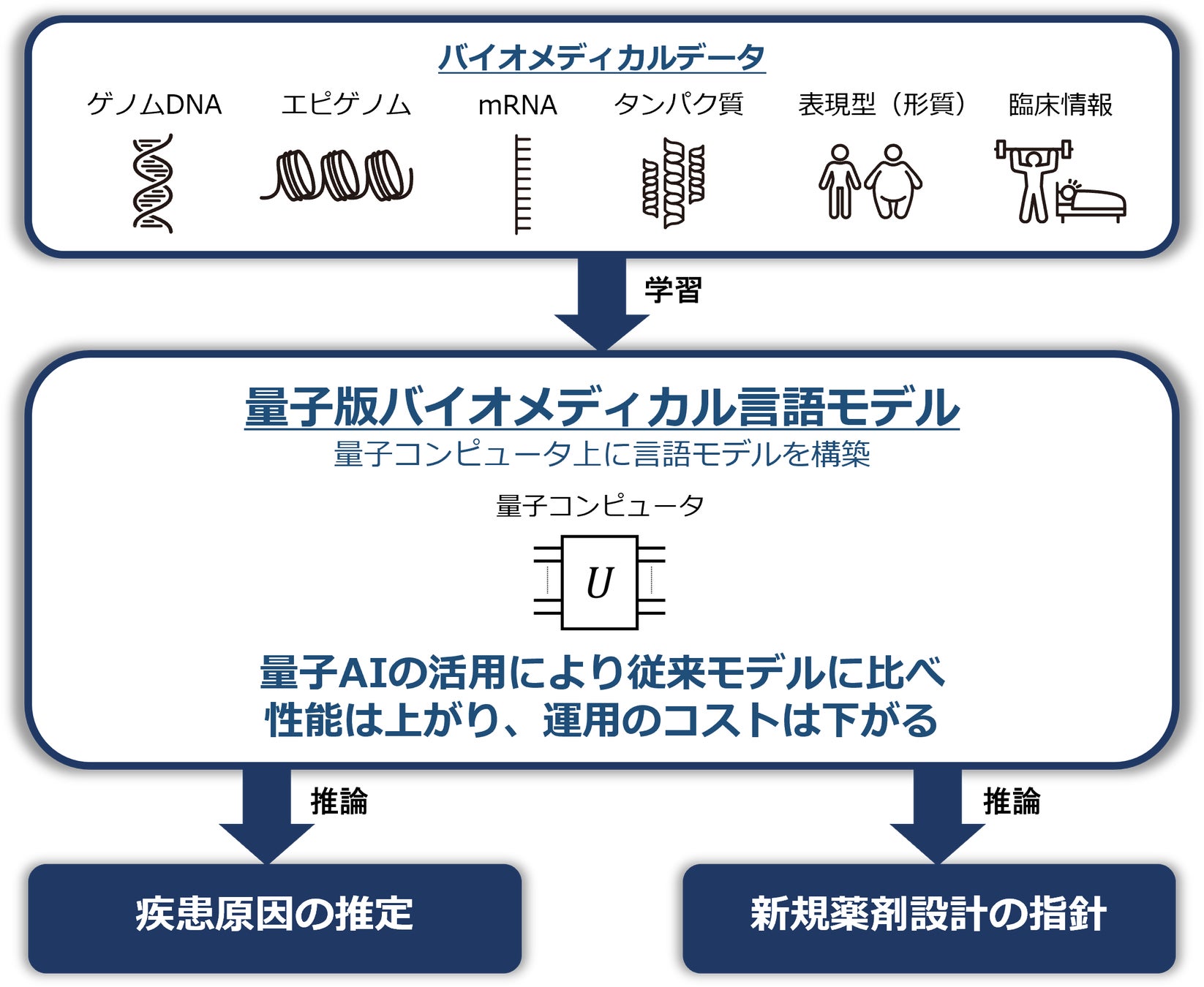 量子AIは、量子コンピュータを用いた人工知能技術であり、大規模言語モデルの運用コストを大幅に削減できると考えられています。具体的には、量子AIにより、これまで古典コンピュータ(現在のコンピュータ)上で学習されていた大規模言語モデルを、量子コンピュータ上で学習・推論させます。これにより、理論的にはモデルのパラメータ数を大幅に削減できると考えられており、将来、モデルの運用に係るコストも大幅に低減すると予想されます。バイオメディカル言語モデルの開発が従来に比べ安価になることで、より多くの研究機関や企業がその運用を通じて、臨床応用に貢献できる道筋が拓けると考えられます。