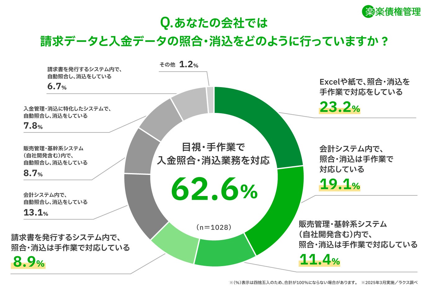 多くの企業では債権管理システムの導入が進んでおらず、全国の経理担当者に調査した結果、約6割の企業が入金照合・消込業務といった債権管理業務を、Excelや目視など手作業で行っているという結果となっています。こうしたアナログな業務フローは、経理担当者の大きな負担となるだけでなく、事業運営上のリスクも内包しています。